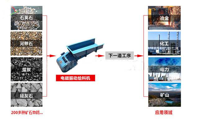 GZ系列电磁振动给料机广泛应用于矿山、冶金、煤炭、建材、轻工、化工、电力、机械、粮食等各行各业中,用于把块状、颗粒状及粉状物料从贮料仓或漏斗中均匀连续或定量地给到受料装置中去。例如,向带式输送机、斗式提升机,筛分设备等给料;向破碎机、粉碎机等喂料,以及用于自动配料,定量包装等,并可用于自动控制的流程中,实现生产流程的自动化。