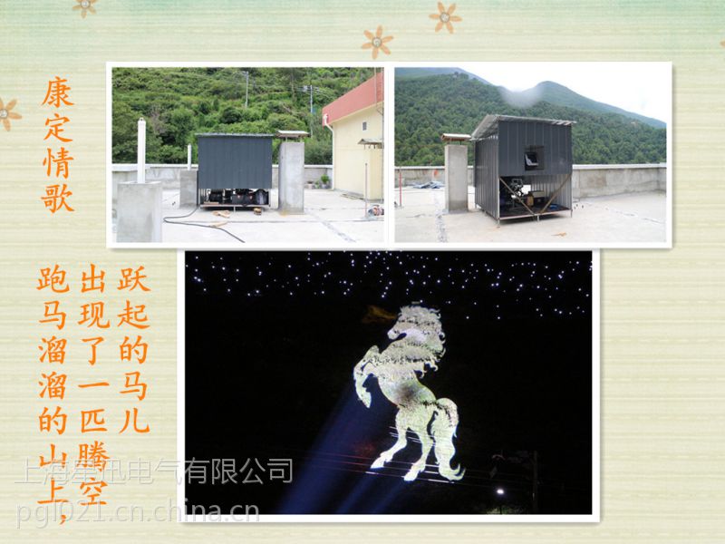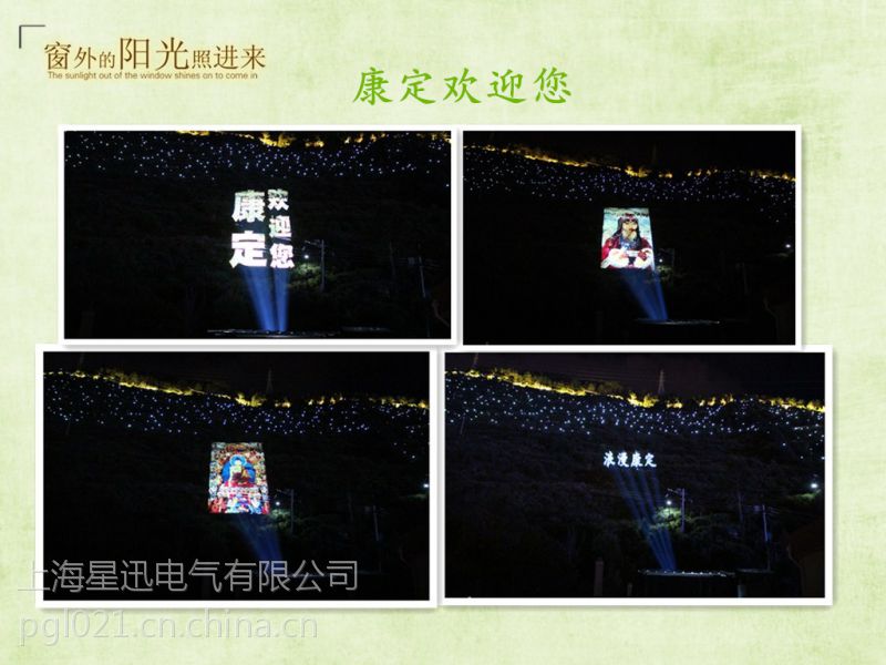 中国PG灯、超大功率户外广告投影灯的先导者---上海星迅电气 上海星迅电气有限公司依托上海交通大学、上海戏剧学院等高校的技术研发实力,结合上海舞台技术研究所及上海舞美艺术中心的技术创新和艺术应用实践。专业从事高亮度视频投影、高功率影象投影成套装置及户内外亮化工程特种灯具的研发、生产、工程安装及服务。是艺术和技术相结合的高新科技企业。 PG投影灯是一种***的大功率投影设备,运用光学投影原理,采用高亮度的光源,将底片上的全彩广告内容投射到高层建筑的外墙上或地面上,在夜间形成极富视觉冲击力的户外广告。广泛应用于各类大型户外或户内场地,包括艺术院团、展览会场、主题公园、市场推广、大中型文艺演出的固定式或流动演出。可增添场景的氛围,突出艺术的效果。 公司成立8年以来,通过各种大中小型演出、公关媒体宣传、产品巨幅广告投影,与国外的帕尼灯(PANI)、PG灯(PIJI)同台演出,展示了我们中国自己的大功率投影地特色。学习国外的***使用方式,结合国内的使用环境能更好的应用于国内各种演出、广告、展会等场所,可以更好的与主办方沟通和协调。 我们的产品以超高亮度,高可靠性著称。得到了***的认可以及好评。