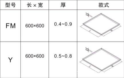 凯诗迪明骨方型扣板厚度为0.5 mm、0.6 mm、0.7 mm、0.8 mm、0.9 mm、1.0 mm、1.2 mm。扣板采用模压成型,标准规格为 350x350mm、600x600mm、600x1200mm。表面涂层一般粉末静电喷涂或聚脂漆喷涂、辊涂,也可选用拉丝和阳极氧化表面处理。