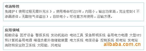 | 电池盖和排气拴结构:阀控式密闭蓄电池 | 类型:固定型蓄电池 | 荷电状态:免维护蓄电池 |