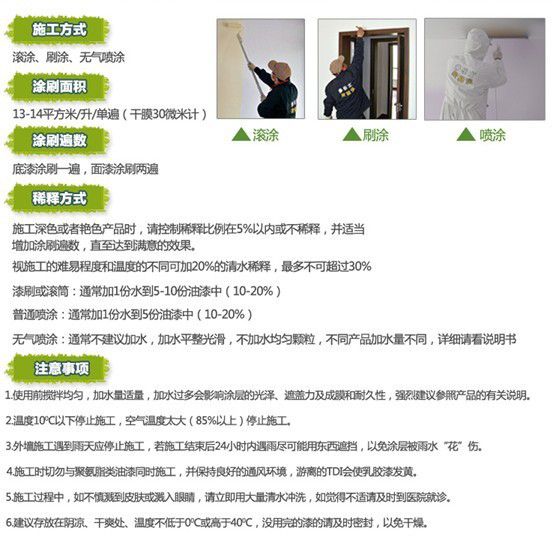 施工温度: 请不要在潮湿或寒冷的天气(气温低于5℃,相对湿度大于85%)情况下施工,否则不能达到预期的涂装效果
