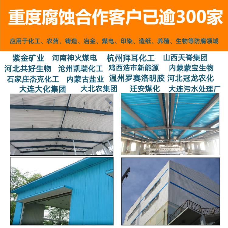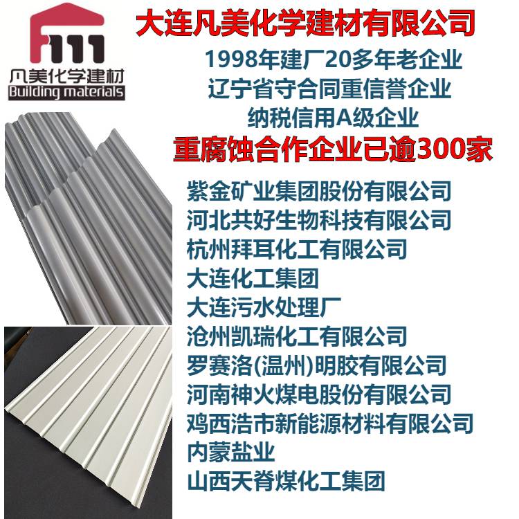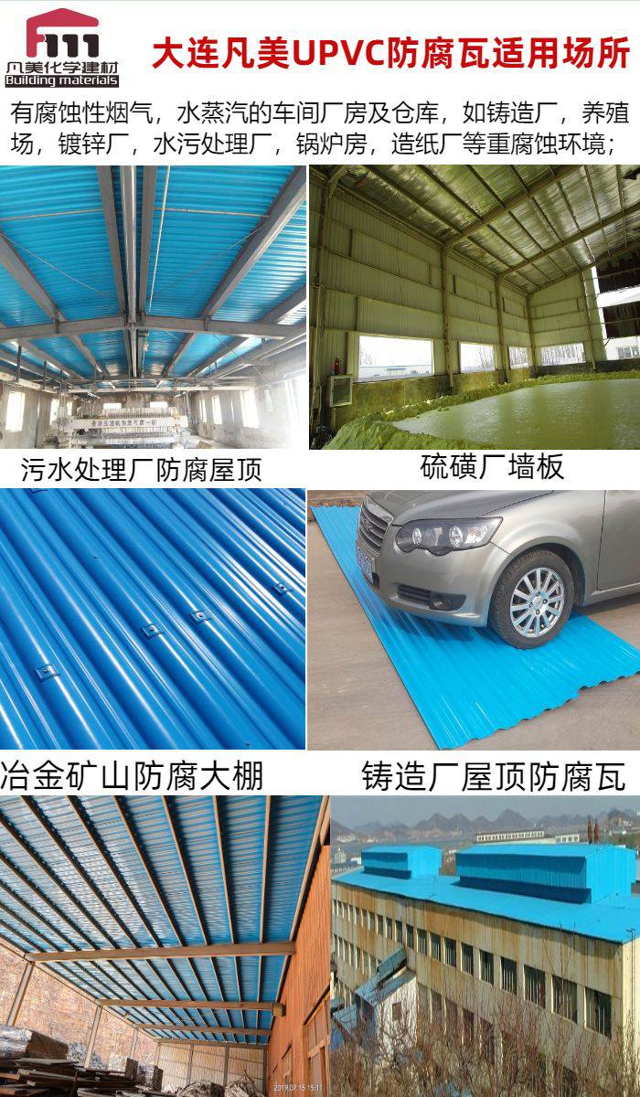 大连凡美UPVC防腐瓦板同时适用于以下重腐蚀环境:1. 盐业、矿业、钼业、铝型材氧化车间、电泳生产车间、焦化厂硫铵车间、陶瓷厂房、 硫化车间、酸洗车间、蓄电池厂、镀锌厂,造纸厂,轧钢车间顶棚及墙壁防腐蚀; 2. 适用化工厂、印染厂染布车间、化纤厂、电厂、稀土冶炼厂,氯碱车间,冶金厂,制革车间,垃圾处理厂,垃圾焚烧电厂,盐库的地坪、车间、天棚、墙壁防腐蚀等。