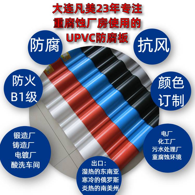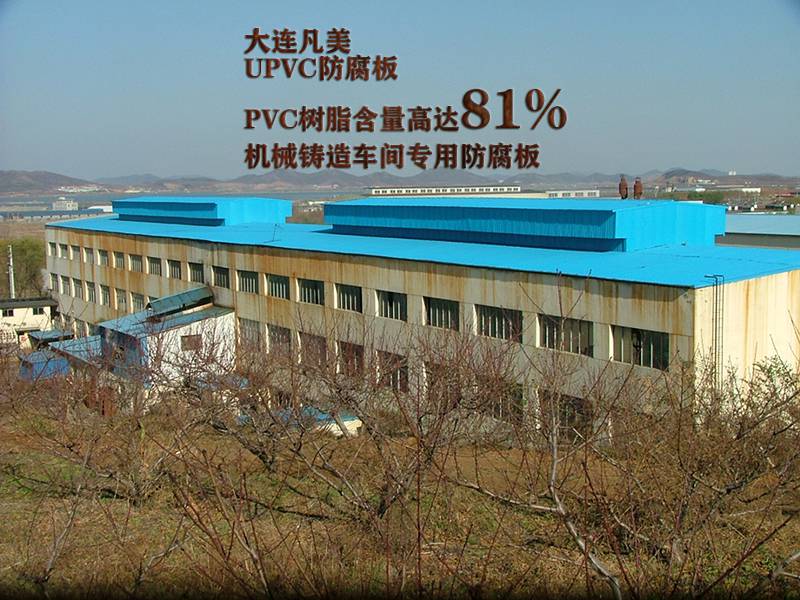 大连凡美UPVC防腐瓦板同时适用于以下重腐蚀环境:1. 盐业、矿业、钼业、铝型材氧化车间、电泳生产车间、焦化厂硫铵车间、陶瓷厂房、 硫化车间、酸洗车间、蓄电池厂、镀锌厂,造纸厂,轧钢车间顶棚及墙壁防腐蚀; 2. 适用化工厂、印染厂染布车间、化纤厂、电厂、稀土冶炼厂,氯碱车间,冶金厂,制革车间,垃圾处理厂,垃圾焚烧电厂,盐库的地坪、车间、天棚、墙壁防腐蚀等。