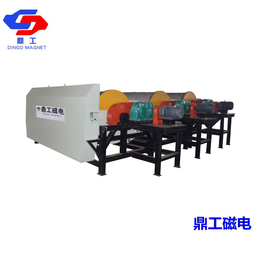 该强磁磁选机系列产品工作原理:将 5 — 8 毫米 的原矿送入上料斗,经过振动电机振动布料,出料量可通过手轮来进行***调整。磁辊通过调速电机拖动,转速的快慢通过调速表来进行调节,可控制磁选机的产量和精矿品位。矿粒经输送带被送入上磁辊分选,由于铁矿的矿粒有磁性,立即被强磁场吸附在磁辊上,脉石粒(杂石、砂土)由于没有磁性(磁性很弱),磁辊的强磁对它不产生吸力,随着磁辊的转动,矿粒一直被吸在磁辊上,而脉石粒在磁辊转到前端位置时被抛出掉在隔矿板的前面(通过改变隔矿板角度的大小可调整精矿的品位),矿粒继续被磁辊带到脱磁区时自动掉入一选集矿斗收集为精矿成品。由于上磁辊掉下的脉石中还夹带有一些磁性更弱的矿粒,它们将进入下磁辊继续进行磁选,磁选后的成品矿粒进入二选集矿斗收集为成品,被抛出的脉石经尾矿口排出,至此磁选工序结束。由于原矿中的脉石被抛弃,所以使铁矿的品位得到提高。整台设备的用电量仅为 4KW 左右,磁选投入成本是相当低的。铁矿磁选机是我公司自主研究开发的高新技术产品,技术已相当成熟。鼎工公司可提供各种磁性矿物的实验样机、实验室,选铁设备,可根据客户不同的选矿要求、矿品味、不同的矿做出选矿流程设计,以及提供实验结果和数据,根据现场试验后为客户推荐最合适的全套除铁设备。欢迎客户来我公司考察!