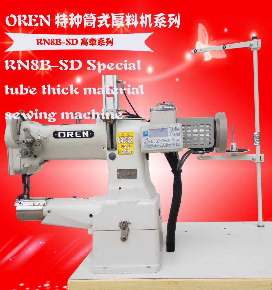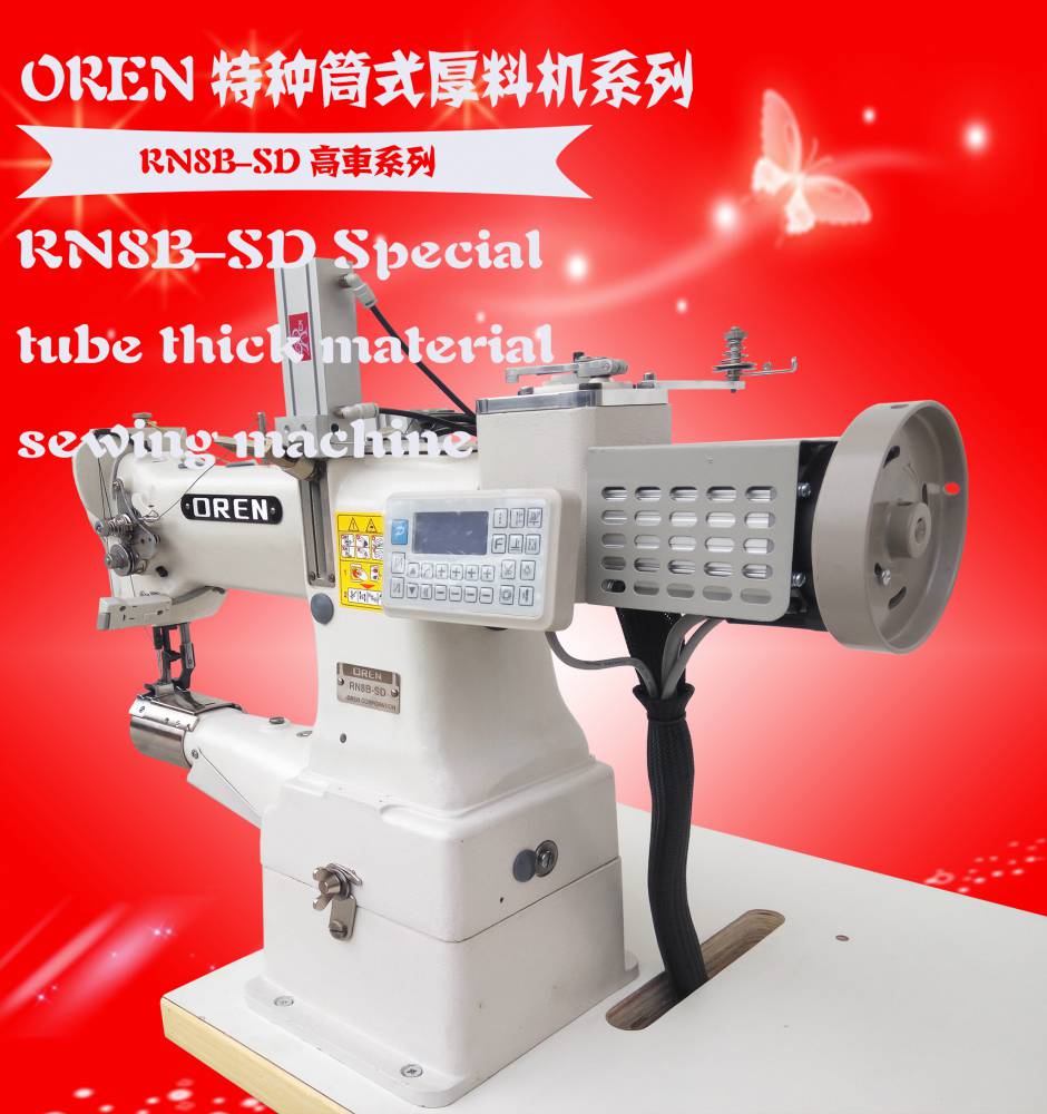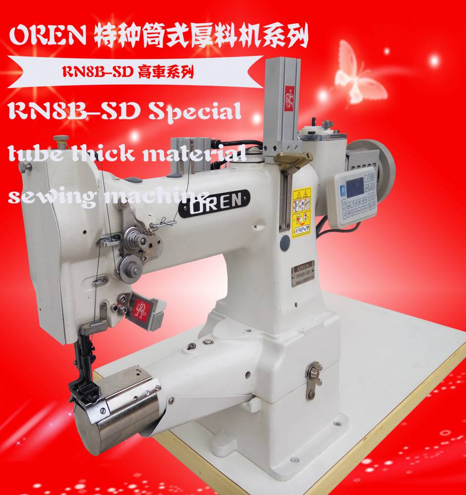 RN-8B小嘴高车【缝纫机】RN8BS-246自动供油缝纫机,本机型是小筒型缝台综合送厚料系列的缝纫机,采用垂直双赔旋梭,机器运转噪音低,震动小等。用途,缝制皮包,口袋,鞋,帆布,皮革制品等,合用于缝制管状物,如皮和鞋子,缝制物品的小回转时缝迹平顺,规格,缝速;2500r.p.m,线迹长度,6mm,正缝倒缝相同,针杆行程38mm,压脚提升量,手动9mm,沏、脚控15mm,使用旋梭是全回转垂直双倍旋梭,使用机针DP*17