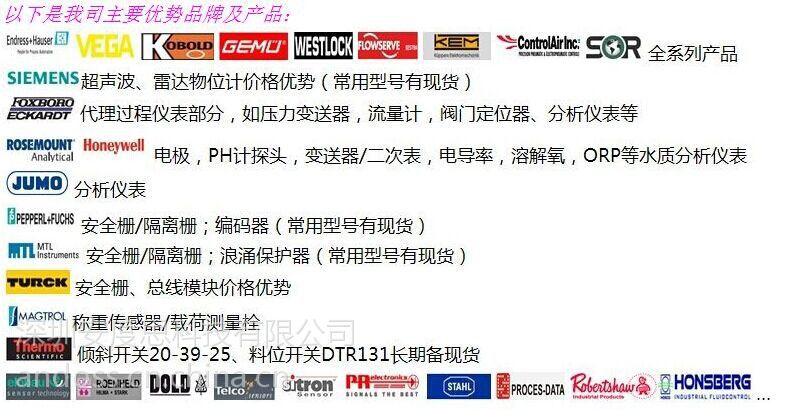 深圳安度思科技有限公司竭诚为广大客户提供全球最***仪器仪表及备品备件的采购服务。经验丰富的专业队伍,***的技术,完善的产品售后服务是我们给您的保障。总部设在德国,致力于为国内客户提供优质低价的德国及欧洲生产的各类工控自动化产品,仪器仪表,备品备件等。 我们通过德国总公司,完成德国,美国境内采购,为您低价购入产品,通过在德国法兰克福的拼货仓库,拼单发货,并集中办理手续,为您节省运费和清关等费用,通过健全的物流程序,每周至少空运发货一次,为您缩短货期,我们以人民币和欧元价成交,给您不同的选择。 销售品牌:VEGA、WADECO、ROSEMOUNT、 SOR、SIEMENS、KNICK、HONEYWELL、 CONTROL-AIR、FOXBORO、MTL、GESTRA RAMSEY、WADECO、ECKARDT、FLOWLINE GEMU、TELCO、TURCK、BALLUFF、JUMO DOLD、R.STAHL、PR、IFM、WIKA、P F等。 我们的宗旨是***打破陈旧的销售模式,采取全新的销售理念,省去各项中间环节,只要您提供品牌和型号,我们就能以***的时间,***的价格提供全新原装正品,更好的服务于中小贸易公司和使用单位,免去您不必要的担心和烦扰,全力为行业客户打造出一个全新的电子商务交易平台。 我们的特点是 “多”、“快”、“好”、“省”------品牌多、货期快、服务好、价格低。 我们作为《中国机电产品进出口商会》的战略合作伙伴。在此***本商城所售产品均为全新、***原装产品,如有问题,***,请广大客户监督! 我们愿与广大客户互惠互利,共创美好明天!