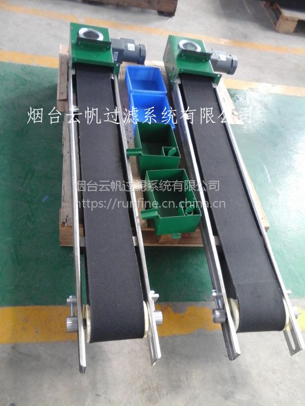 皮带式撇油机是将撇油带浸入在液体储槽内,由特殊纤维制成的连续循环式皮带,将滞留在主液体表层的油脂利用粘度及表面张力的差异性区别,将粘度较高的油脂附着在皮带表面,经连续循环且持续吸取排出油脂的设备