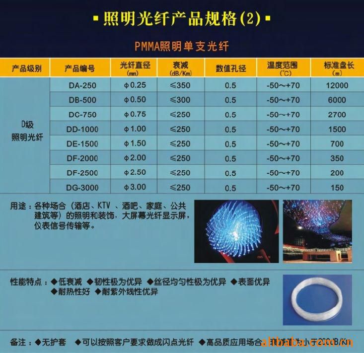 塑料光纤具有色彩多样、柔性传输的特点,用于光纤灯具、光纤装饰工程可以营造出五颜六色、如梦如幻的视觉效果。适用于酒店、KTV、酒吧、家庭、公共建筑、广告、装饰品等场所。