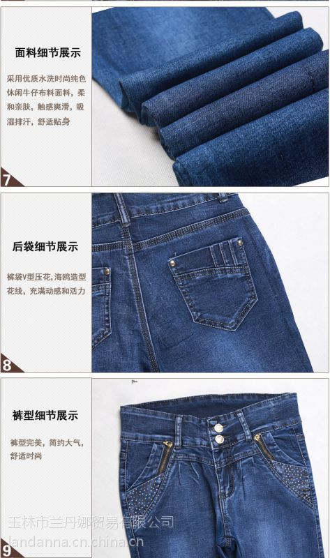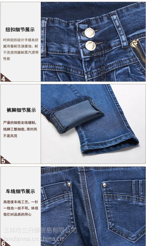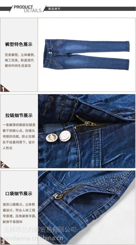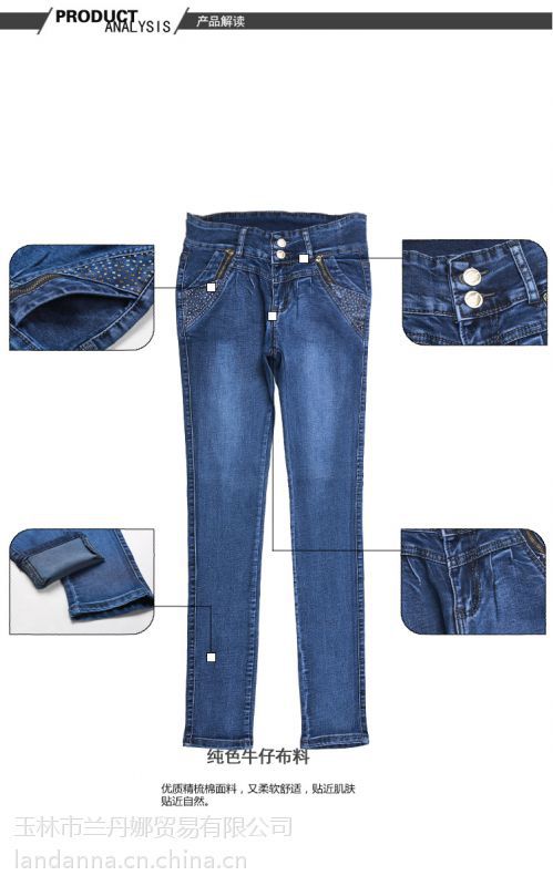 本页信息为玉林市兰丹娜贸易有限公司为您提供的"2015秋季新款女式牛仔裤中腰显瘦提臀弹力修身小脚裤潮流铅笔裤批发"产品信息,如您想了解更多关于"2015秋季新款女式牛仔裤中腰显瘦提臀弹力修身小脚裤潮流铅笔裤批发"价格、型号、厂家请联系厂家,或给厂家留言。 进入店铺