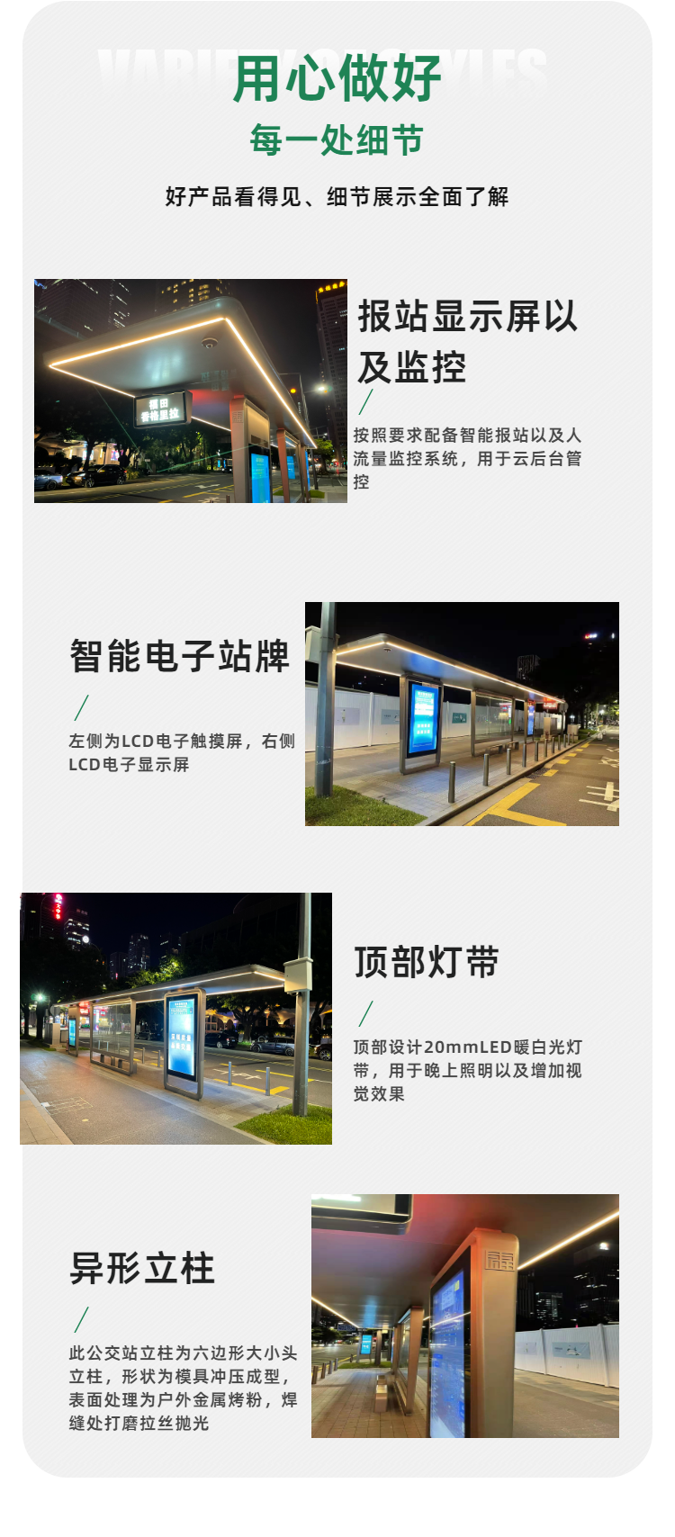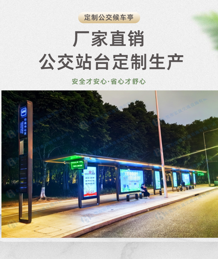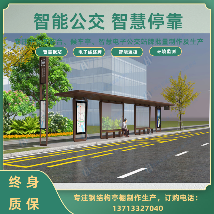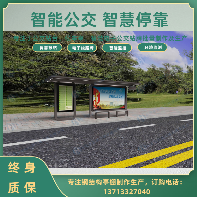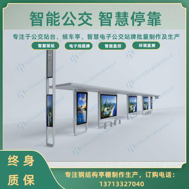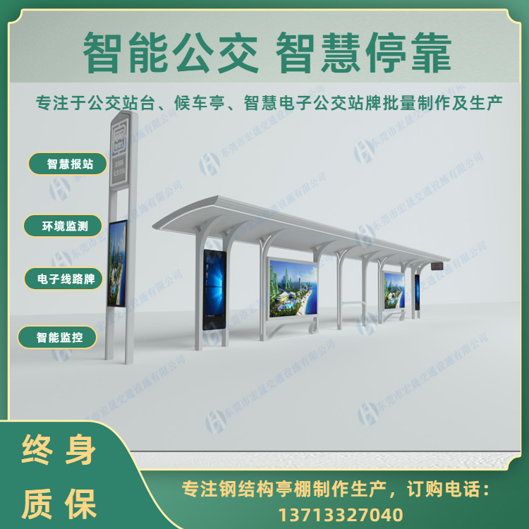 宏晟公司简介: 东莞市宏晟交通设施有限公司是专业生产城市交通设施的厂家。 公司本着“创造文明城市、成就和谐社会”的企业使命和“对自己负责、对客户负责、对行业负责、对社会负责、对未来负责”的企业宗旨,不断为客户提供科技创新的产品,提升城市的精神面貌与道路交通的发展。经过多年的用心经营成为发展中城市的建设者与传播者。 本公司专注于“候车亭,收费亭,报刊亭,公共自行车亭、棚,信息亭,彩票亭,奶茶亭,早餐亭等钢结构产品”引用的国内外***技术,将宏晟打造成为一家集研发,生产,销售和服务为一体的智能城市交通高新技术企业。为迎合目前国内外的安全形势,将产品定位于城市道路交通安全产品的研发、设计、生产。 公司充分利用在机械、电子方面所具有的经验与优势,结合优质的供应商产业资源,秉承“品质乃企业生命”、“创新利于民,产品便于民”的开发思路的理念,不断提升产品品质,以的价格、的品质和服务提供给客户!在坚持科技创新,博采众长,不断吸收世界前沿科技成果,陆续新研发生产智能公交候车亭、电轨候车亭、智能高速公路收费亭、智能一体化信息亭等全新模式的道路交通新产品。 宏晟公司针对全国交通设施的市场,我们的优势有: 1、 价格优势:拥有市场同类产品竞争力的价格,同时拥有比之更高的品质***; 2、 性能优势:智能创新,具有高端优质的供应商结合工程研发利民便民的高端产品; 3、 质量优势:材料到成品,研发到生产的全程可控性,成为产品质量可靠性的***; 4、 服务优势:同等条件下更加优质的服务,同样的服务,具备更加全面的合作; 5、 技术优势:本公司具有优先的生产设备、有专业生产的***技术员、专业研发设计新产品的***工程师、具有***服务及安装工程部门,工程安装能力级强,售后维修有工程师和经过专门培训的技术安装人员在时间内响应并采取***措施。能有效地运行和提供培训采购、生产、运输、安装、维修、等服务工作。 向着“专业生产、规模销售、***服务”的经营方针,公司将主要开发面向21世纪市场高科技交通产品,不断推出更多的新品,形成规模,降低成本,树立全新的信息交通产品品牌,在全国范围内组建更完善的销售网络和售后服务体系。 有了您的支持才有我们的今天,有了您的信任才有我们的明天!请一如既往的支持我们,让我们携手共创美好未来!