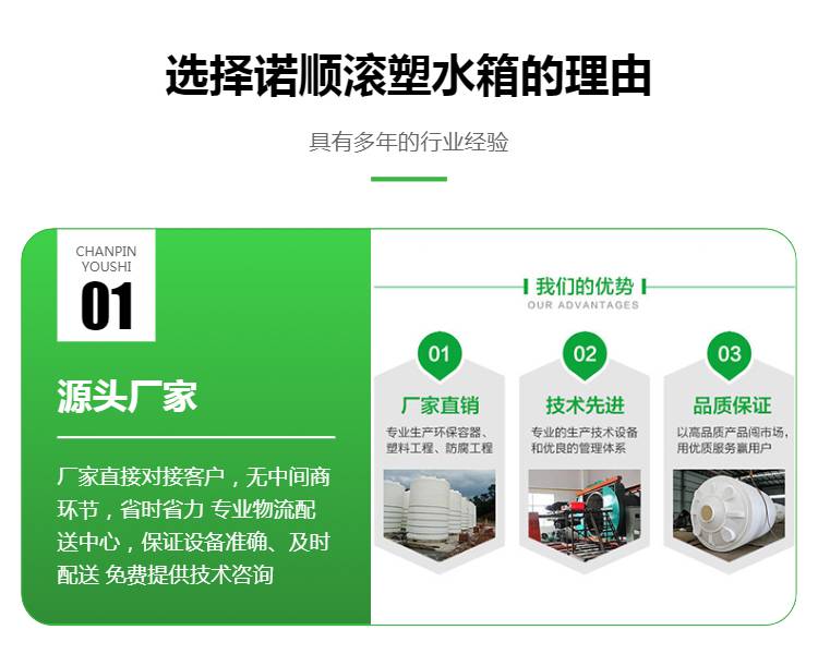 武汉塑料水箱生产厂家批发滚塑食PE水箱;武汉诺顺塑料制品有限公司主要致力于滚塑制品和注塑制品,专业制造销售各种规格的塑料水箱、塑料水塔、塑料储罐、PE储罐、滚塑防腐储罐、塑料化工储罐、塑料方箱、塑料圆桶、塑料托盘、垃圾桶、塑料筐、周转箱等塑料制品。公司主要生产的立式、卧式、异形多种式样的塑料储罐,pe贮罐,搅拌罐环保储罐,全塑防腐储罐,酸碱储罐,特种化工液体储罐)种类多规格全,技术及产品质量在国内行业处于***。 武汉诺顺塑料制品有限公司采用国外成熟的ROTATION(旋转成型)一次完整成型技术,专业生产PE水箱(0.2吨-30吨)、塑料储罐(200L-30000L)、耐酸碱桶、加药箱(50L-2000L)、腌制桶(50L-3500L),水产方箱(50L-1500L)、塑料渔船(2.5米、3.2米、4.1米、6米)等滚塑产品。具有造型美观,内外光滑无焊缝、耐酸耐碱、耐碰撞、耐冲击,耐高温(65℃)、耐冷冻(-20℃)、不渗漏、不易老化、无需维修及清洗、安装、运输安全,便捷等优势。