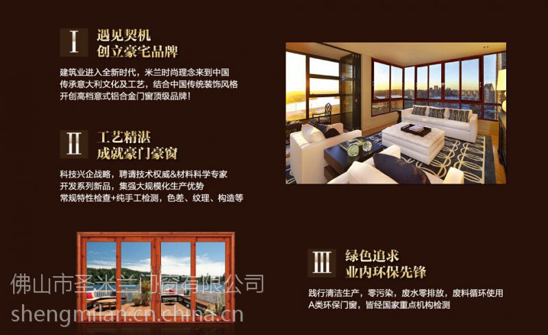 佛山市圣米兰门窗有限公司是一家集自主研发、生产、销售欧式铝合金门窗、别墅阳光房系统于一体的综合型企业,专为全国消费者定制***铝合金门窗、平开门、推拉门、重型推拉门、断桥窗纱一体、平开窗、推拉窗、折叠门、吊趟门等。圣米兰门窗致力于传承意大利艺术文化和工艺技术,结合中国人传统装饰风格,****** 意式铝合金门窗品牌!公司先后荣获中国***品牌、广东***铝门***、质量技术***单位、绿色环保产品、广东省门业协会副会长单位等荣誉。