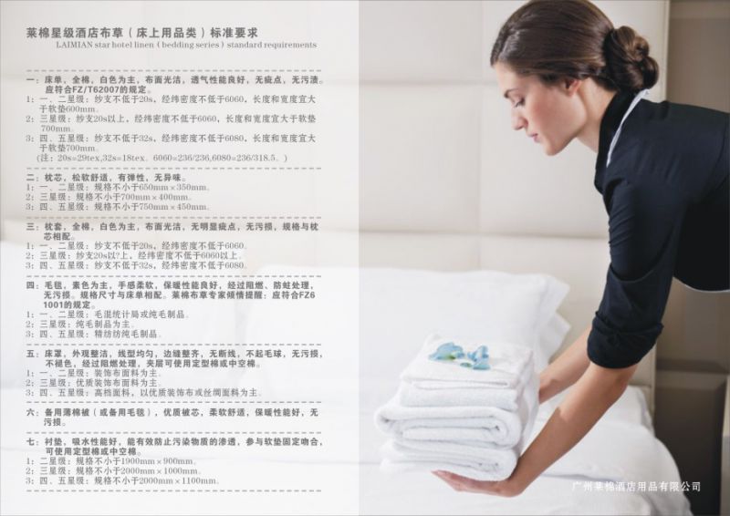 莱棉布草一直秉承“服务一家酒店,树立一家***”的宗旨。莱棉所创的努力是让更多的高端用户享受更多品牌的附加值,这也是莱棉酒店用品有限公司一直所追求的。