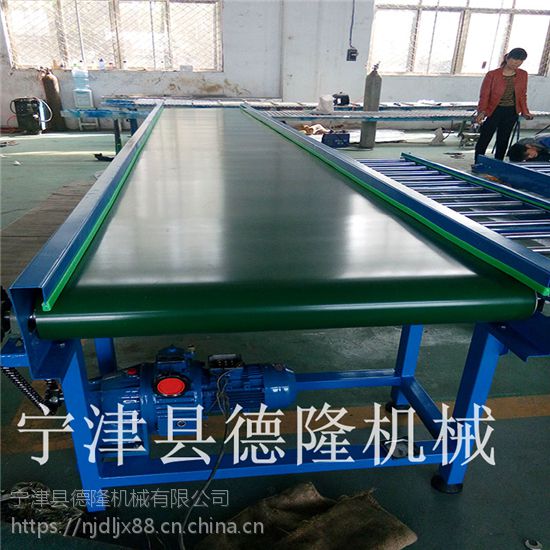 转弯皮带输送机扇形皮带加装专用的防跑偏滚轮(轴承外加聚甲醛POM)或者在输送带的外侧高频焊接导向筋使输送带运行在专用的导轨中,辊筒采用专用的锥型包胶辊筒,广泛应用在食品、饮料、电子、烟草等行业,我们可以选用较小直径的滚筒,使转角连接更加方便,***的解决过渡问题。