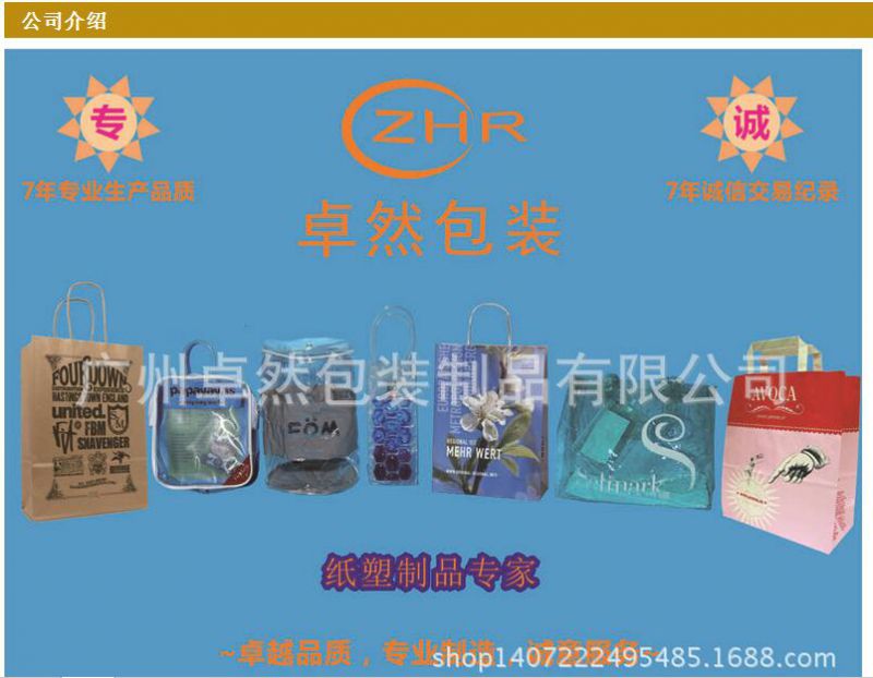 广州卓然包装制品有限公司是一家集设计、开发和生产各种***环保袋、包装袋、广告袋、购物袋为一体的企业。我们的主要产品有: 包装袋系列:无纺布袋、编织袋,覆膜袋、折叠袋、礼品袋、广告袋 塑料袋系列:冲孔袋、吊带袋、背心袋、OPP袋、PVC袋、EVA袋、共挤膜快递袋、复合袋、PP礼品袋 环保袋系列:棉布袋、帆布袋、涤纶袋、牛津布袋、穿绳袋、西装袋、棉被袋、保温袋、广告围裙 纸制品系列:铜版纸袋、牛皮纸袋、特种纸袋、纸盒 广州卓然包装拥有***的制袋机、印刷机,配套齐全的后工序设备。业务范围覆盖全国,货期迅速,严格生产,价廉物美,质量***。2016年卓然包装会一如既往以***的技术、热情的服务、优质的产品和低廉的价格,让我们成为您更安全、更方便、更快捷、更放心的合作伙伴。欢迎广大新老客户联系洽谈业务!