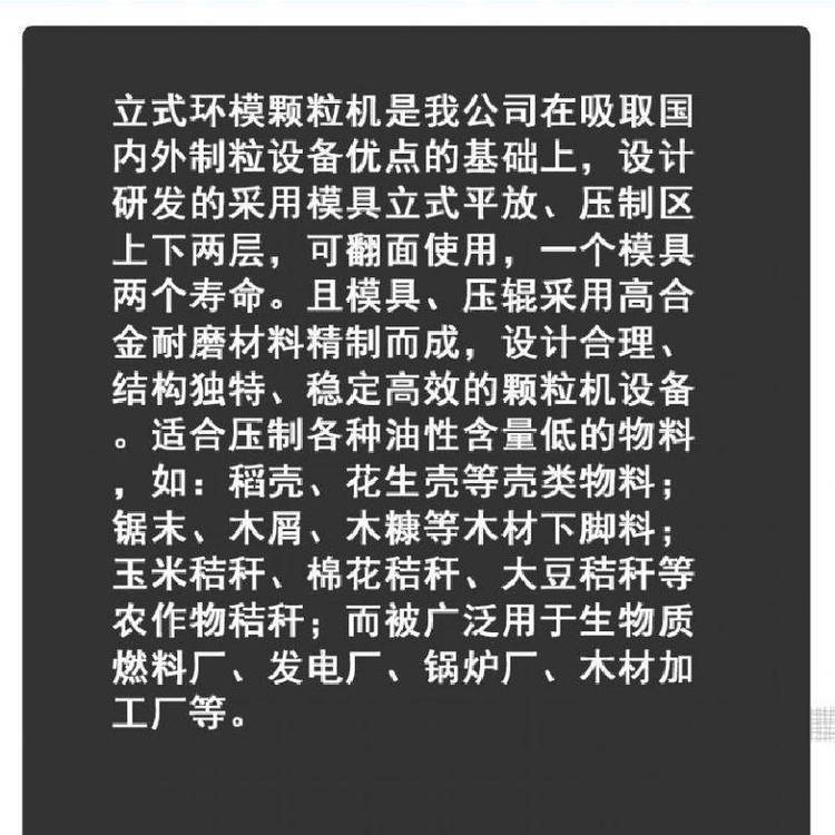 立式环模离心高效颗粒机适合压制难粘合、成型难的物料,如稻壳、葵花籽壳、花生壳等各种瓜果壳,树枝、树干、树皮等各种木材下脚料;各种农作物秸秆;橡胶、水泥、灰渣等各种化工原料。应用于生物质燃料厂、木材加工厂、发电厂、肥料厂、化工厂等,是投资小、见效快,***理想的压缩致密成型设备。