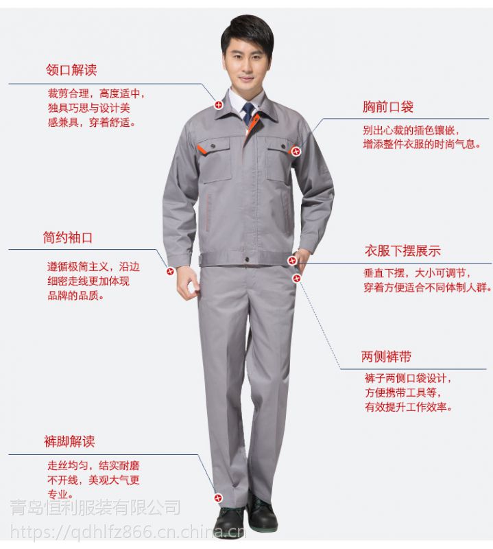 平度工作服套装定做厂家供应春秋长袖企业工装制服批量加工订做劳保服青岛恒利服装有限公司,青岛男式工作服力争间接大方,面料舒服。赋予了男性员工的粗犷和大气。一款好的男式工作服,首先是视觉感受,如果说员工穿上,让人看上去别扭,那这款服装就选择错了。只有舒服了,得体了,合身了,创新了,才算好产品。