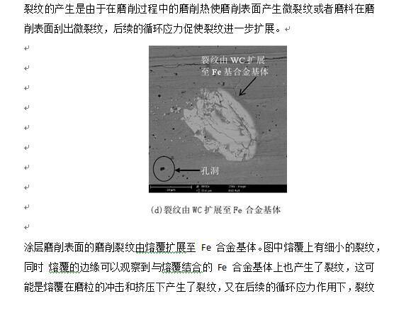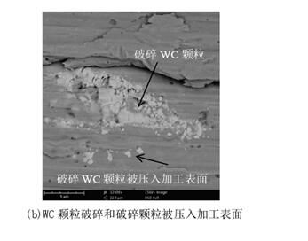 涂层中熔覆颗粒破碎以及破碎的 熔覆 颗粒被压入加工表面。由于熔覆颗粒有多个解理面,在经过砂轮磨粒的冲击和挤压时沿多个解理面断裂甚至破碎磨粒对熔覆颗粒的切削效果减弱,而形成冲击和挤压作用,所以熔覆颗粒发生比较严重的破碎部分破碎的熔覆在磨粒的挤压下又被压入较软的 Fe 合金基体。
