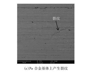 裂纹扩展到熔覆周围的 Fe 合金基体上。