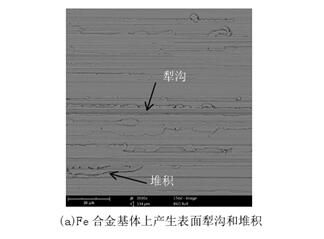 磨削后的 涂层表面存在犁沟和堆积。涂层表面犁沟的形成可能是由砂轮的磨粒或涂层中脱落的 涂层 颗粒在涂层表面产生耕犁作用引起的。Fe 合金基体堆积到已加工表面上,则可能是在磨削过程中磨粒在 Fe 合金基体表面刻划,使 Fe 合金向刻划的两侧隆起,而后又被熨压到涂层表面。