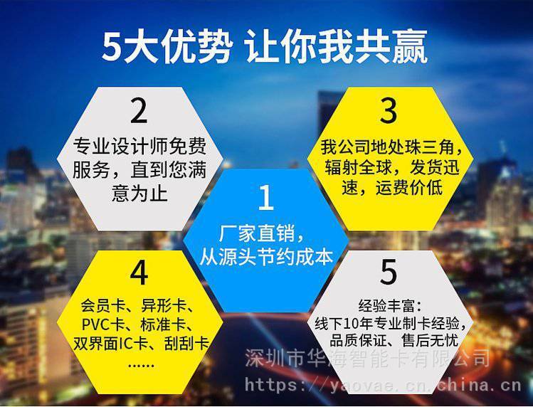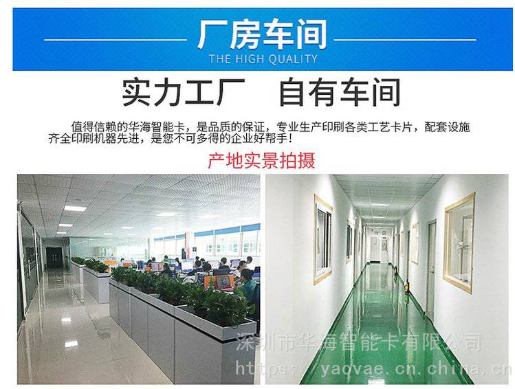 深圳市华海智能卡有限公司,成立于2008年,是专业从事各种PVC会员卡、IC卡、ID卡、、SIM测试卡、耦合卡、NFC卡、CPU卡、人像工作证、校园学生卡、工牌厂牌、展会代表嘉宾证、织带卡,硅胶腕带卡、滴胶卡、钥匙扣、电子标签、礼品刮刮卡、积分卡 、吊牌卡 透明磨砂卡、条码卡、磁条卡,PSAM卡、内存卡的生产与销售等。 深圳市华海智能卡有限公司的RFID/NFC产品,包括多种尺寸的PVC卡、接触式与非接触式智能卡、异形TAG、SIM卡,电子标签等,可根据用户要求设计生产特殊尺寸和形状,可提供不同协议接口的读卡电路模块。 公司拥有***的制卡设备如:德国海德堡4色印刷机、全自动层合机、高速冲卡机、全自动高速裱磁机、全自动碰焊机、全自动绕线机、平码机、高速凸码机、全自动高速烫金机、NBS凸码机器,激光码机器、UV光固化机、高速全自动识别喷码机、全自动高速写磁机、贴标机、全自动高速包装机等全套制卡行业的***设备,涉足高中低各频段RFID标签产品的开发和行业应用,是业内应用芯片类型最为全面的生产厂商之一。
