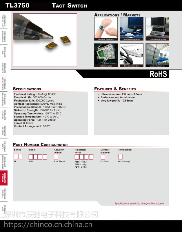 The applications and markets for the switch include the ever-growing wearable technology market, medical equipment, audio/visual, computer peripherals, consumer electronics, telecommunications, instrumentation and more.