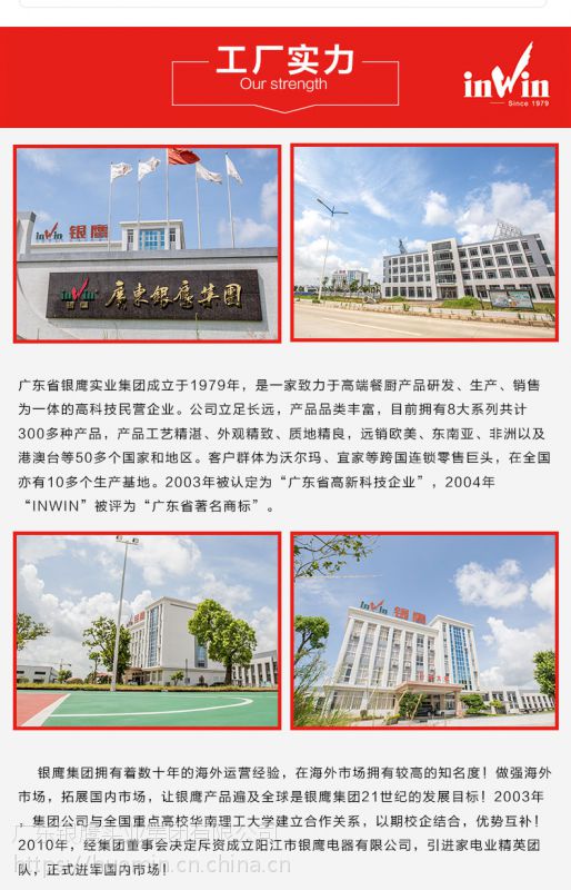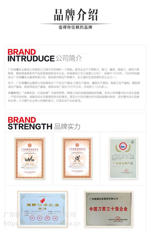 广东银鹰实业集团公司是阳江刀剪外向发展的一个典型。是专业生产不锈钢刀、剪刀、电器、餐具、陶瓷刀、***不锈钢锅、精密铸造等系列产品的国家高新技术企业。前身是阳江市江城漠江火机厂,始建于1979年,1999年组建成立广东银鹰实业集团有限公司,是目前中国生产规模大、实力强的***民营科技企业之一。 如今,广东银鹰实业集团公司现拥有五个产品生产基地:刀剪生产基地、餐具生产基地、陶瓷刀生产基地、精密铸造生产基地、厨房用品生产基地,拥有标准厂房约10万平方米,共有职工1200多人。 近年来,银鹰集团得到快速发展:经济指标逐年稳步上升;科技实力不断增强;通过技术改造传统产业;企业转型升级;自主品牌创新;生产规模不断扩大。于2008年6月在阳东那霍工业区已破土动工研发陶瓷刀产品,2009年7月银鹰产出批质量与国际接轨的陶瓷刀,在日用陶瓷界引起强烈震撼,***了国内陶瓷刀批量生产的先河。2014年公司实现资产总额3.9亿元,2014年实现总产值达3.8亿元,销售额达3.6万元,出口创汇4656万美元,创税利2278万元;为了继续做大做强,企业转型升级,2010年集团公司在阳江市银岭科技工业园逐步成立阳江市银鹰厨房用品有限公司、阳江市银鹰电器有限公司、阳江市银嘉阀业有限公司,专营研发和生产***锅、环保分子共振炉、厨具、压力煲、精铸管件、阀门等系列产品,该项目经过近两年的建设并已试产成功,目前已批量生产阶段中。根据公司目前生产发展情况来看,预计今年生产销售额比去年增加30%以上,项目实施增强产品竞争力,全面***国内市场提升自主品牌的生命力,进一步提高***,扩大内需及出口,提高了企业经济效益,地方税收增加,支援地方建设,为社会就业和再就业提供机会。 银鹰集团以“依靠科技、打造品牌”为指导思想,根据公司的发展战略规划部署,未来公司将重点加大自主品牌、产品开发创新、装备自动化及管理信息化的建设,落实从外延式增长向内涵效益增长转变,逐步提升自主品牌的比例,大力提升企业核心发展的能力,打造五金产业的航母。