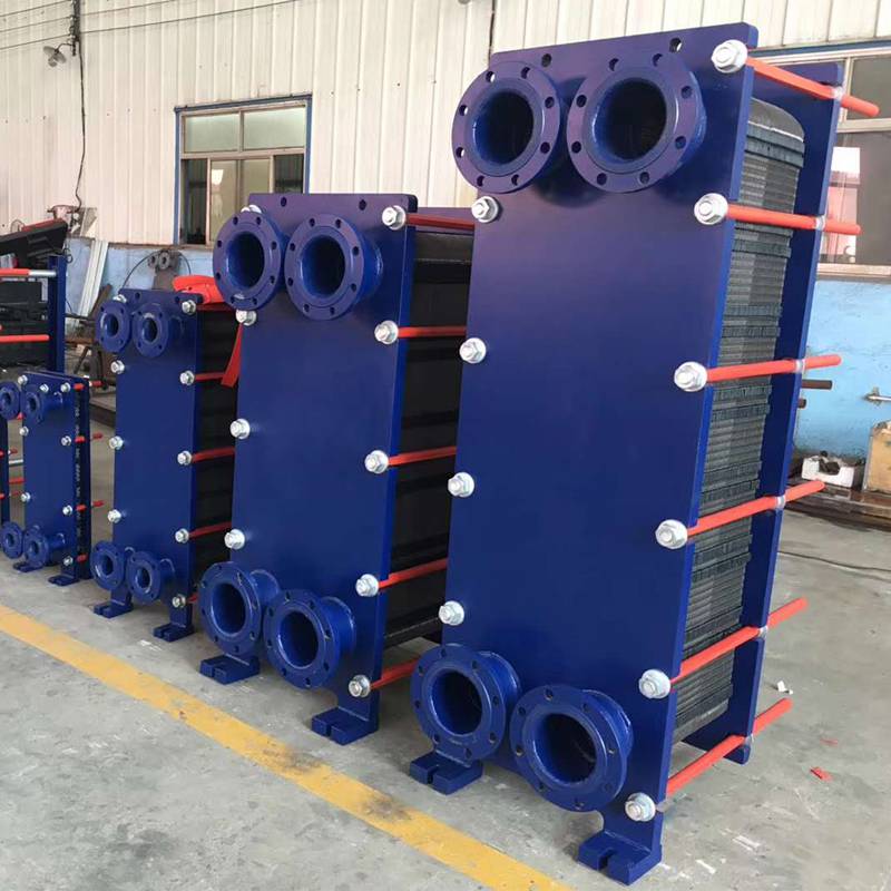 板式换热器是用薄金属板压制成具有一定波纹形状的换热板片,然后叠装,用夹板、螺栓紧固而成的一种换热器。各种板片之间形成薄矩形通道,通过半片进行热量交换。工作流体在两块板片间形成的窄小而曲折的通道中流过。冷热流体依次通过流道,中间有一隔层板片将流体分开,并通过此板片进行换热。 板式换热器的结构及换热原理决定了其具有结构紧凑、占地面积小、传热效***、操作灵活性大、应用范围广、热损失小、安装和清洗方便等特点。
