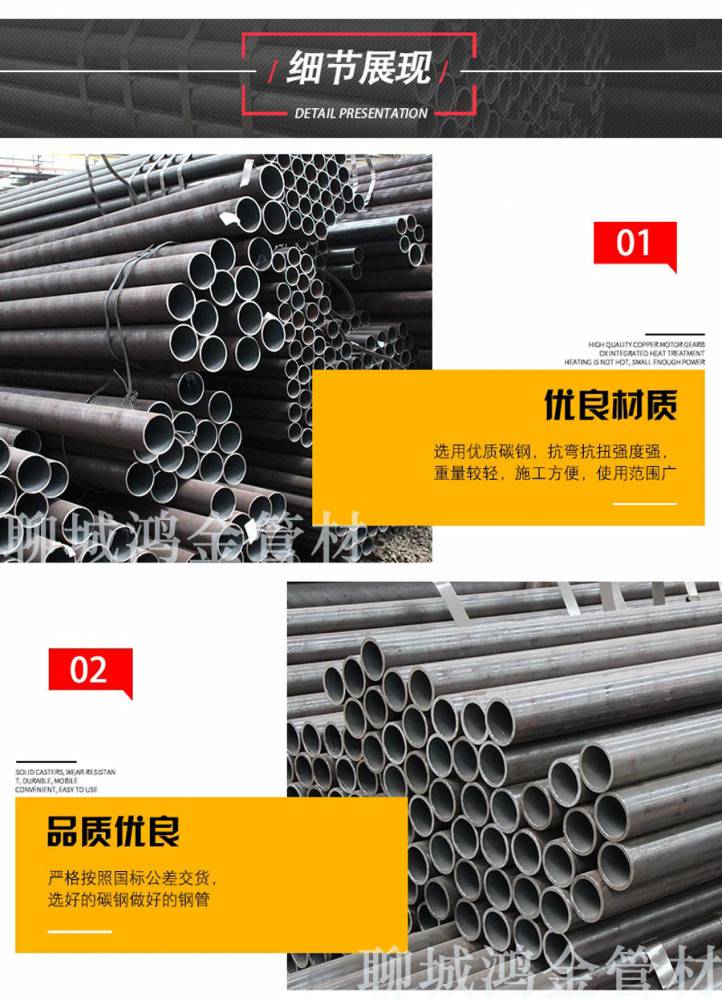 聊城市鸿金管材有限公司是专业从事无缝钢管、精密管、合金管、轴承钢管、国产、进口耐磨钢板的大型贸易及生产商,专营各种进口、国产碳钢管、合金钢管以及各类耐高温、耐低温、耐腐蚀管道材料,主要使用与石油、化工、火电,核电,船舶,桥梁,消防,给排水等工程项目。鸿金管材常年库存各种规格和材质的现货钢管20000余吨,流动资金超过2亿元,年销售额超过4亿元,进出口额超2000万美元。主要经营天津无缝钢管集团、包钢、宝钢、衡阳、鞍钢、成都,等国有大厂产无缝管。