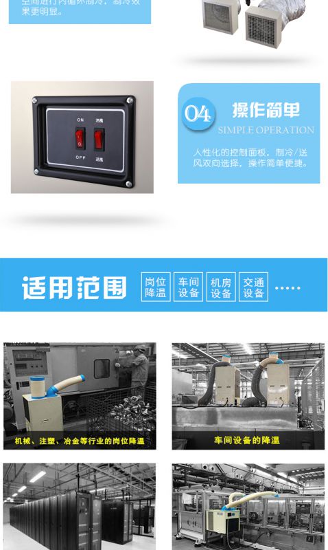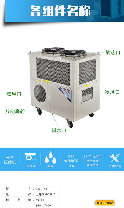 | 类型:工业空调 | 用途:降温制冷通风 | 控温范围:出风低于环境10-15度 |
