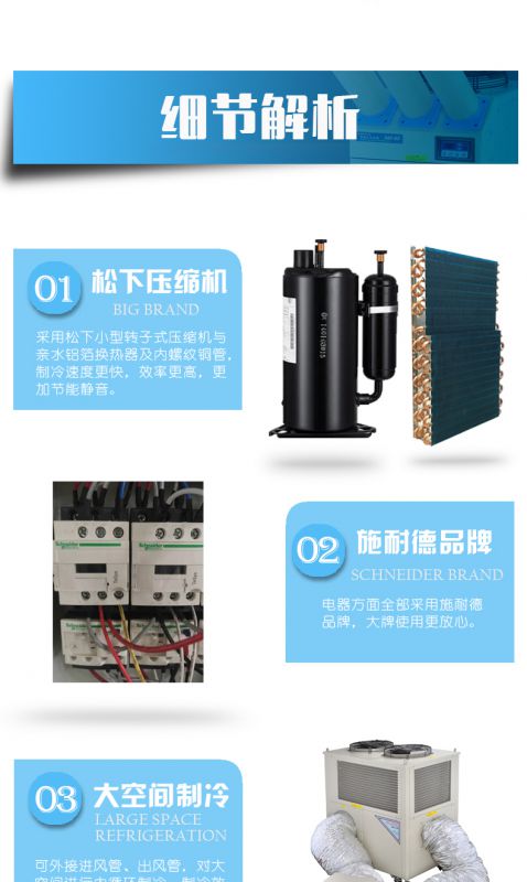 传统空调采用的是内循环降温的方式,不断对室内的冷空气降温,室外的新风无法进入。工业空调/冷气机可以采用内循环的方式也可以采用新风直吹的方式来降温,更多选择。