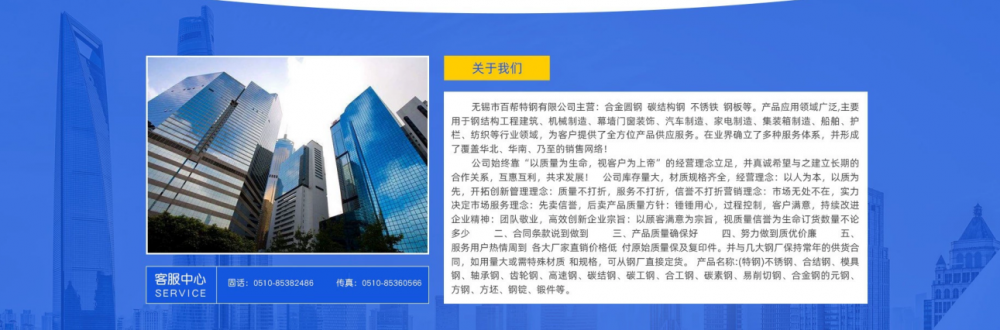 无锡市百帮特钢有限公司专业经营各种进口、国产合金钢、不锈钢、碳钢管材、板材、棒材、型材、管道配件等,为石油、化工和电力行业提供配套(管件)材料。是中国石油化工股份有限公司物资装备部***的中国石化合金钢管配送中心,中国石油天然气集团公司一级供应网络企业。