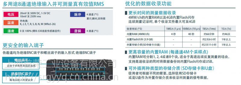 汽车/铁路/航空/宇宙等运行/飞行实验、钢铁等生产中的探伤测定、医疗/制药中的生体测定等波形记录,电机电子、食品、农业、重电、物流***。汽车行业(汽车、摩托车)测试 、家电(电器行业)厂家测试(含PC) 、油田测试(含海洋钻井) 、各类野外测试、灭菌室、洁净室的温湿度测试 、冷藏运输记录 、跌落试验 振动试验撞击试验环境试验等 。多功能输入测量包括:电压,温度,湿度,脉冲,频率,逻辑。