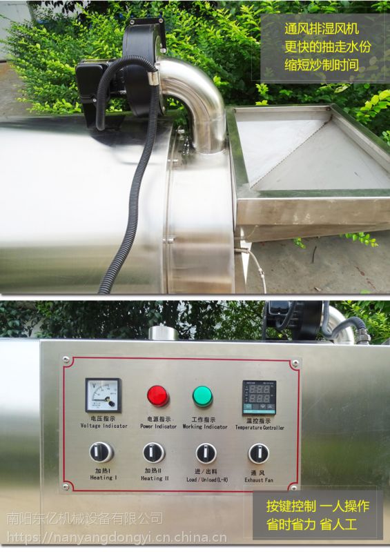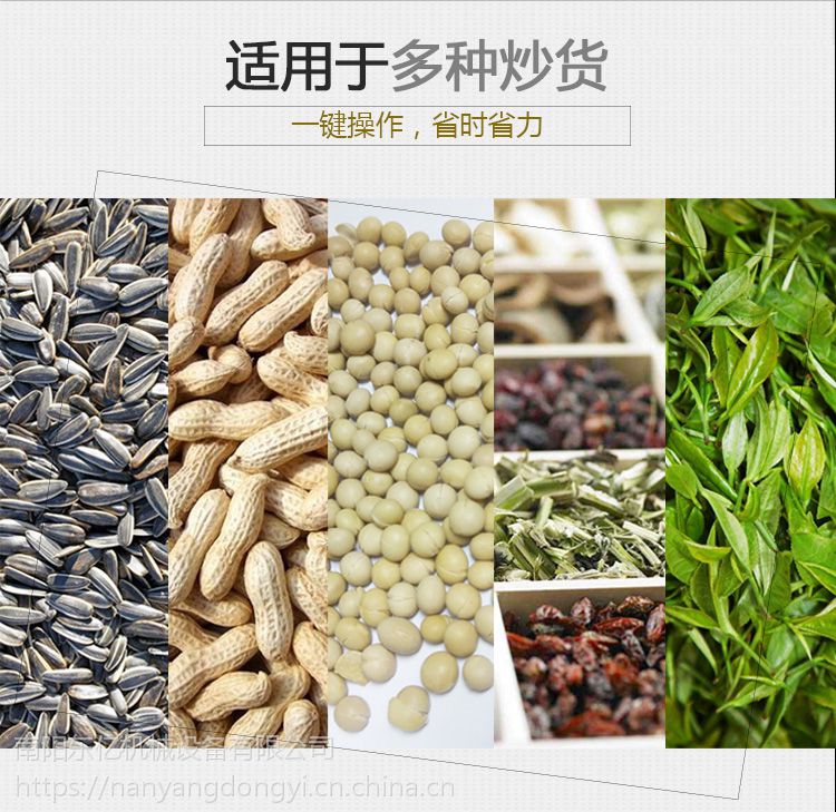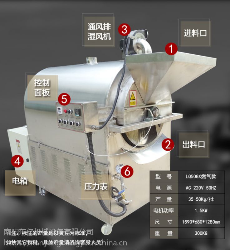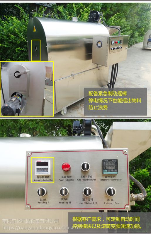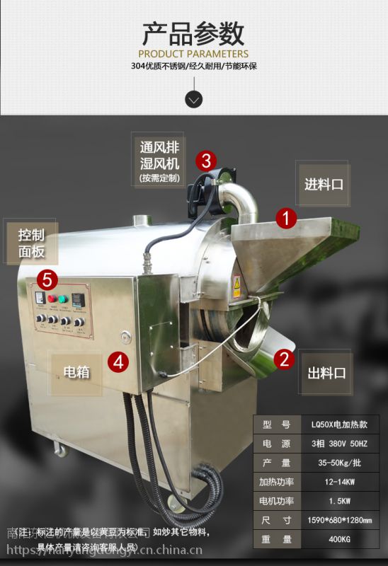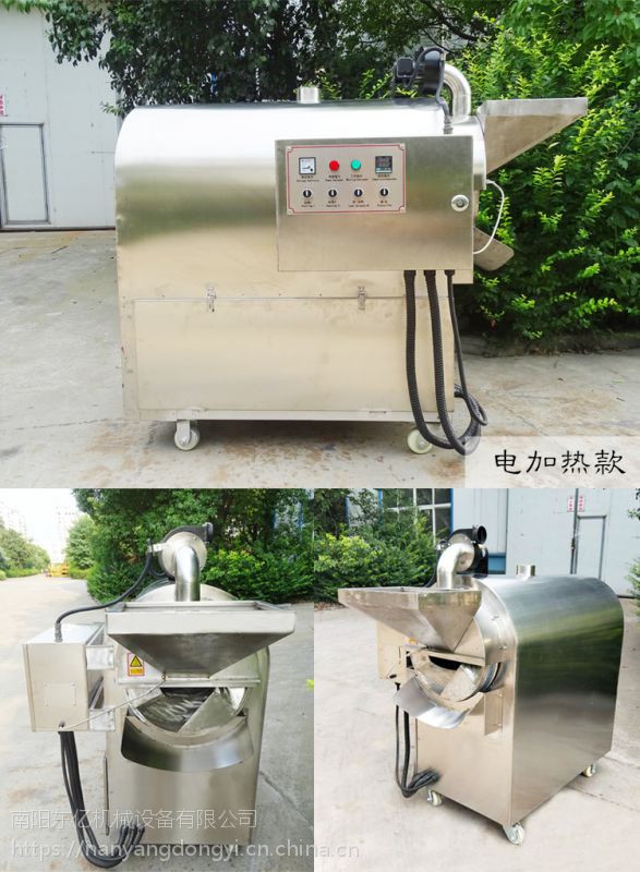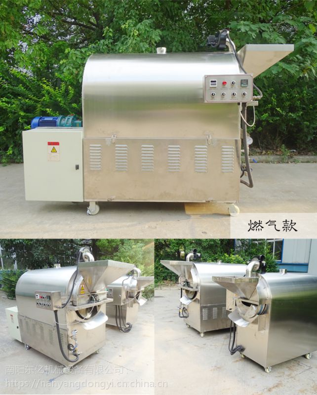 产品有电加热款和燃气款,豪华款和经济款,其中电加热款可选装排湿除尘热风系统。燃气款自带。自动控制模块可选择。铸铁锰火炉和火排炉可选,适应天然气、液化气,耐温热风风机辅助排湿除尘,排烟助燃,远红外同心轴内锅,导热快,受热均匀,无噪音,电子自动点火,电磁阀控制近气,304不锈钢制造,可水洗不生锈,经久耐用。本机具备多种物料炒货功能,装载量参照豆类、米类1:1体积重量设计,设备型号即代表装载量。如您加工花生果瓜子等轻抛物料时,建议购买大一型号以***实际装载量