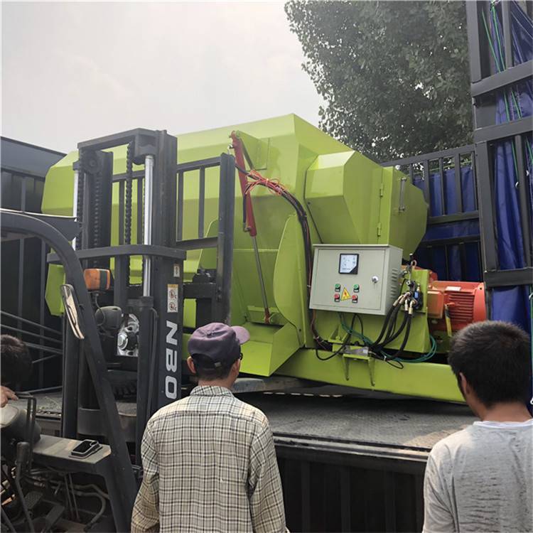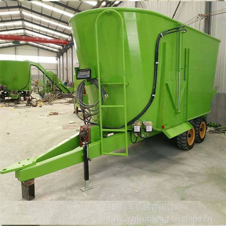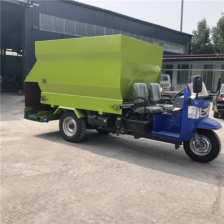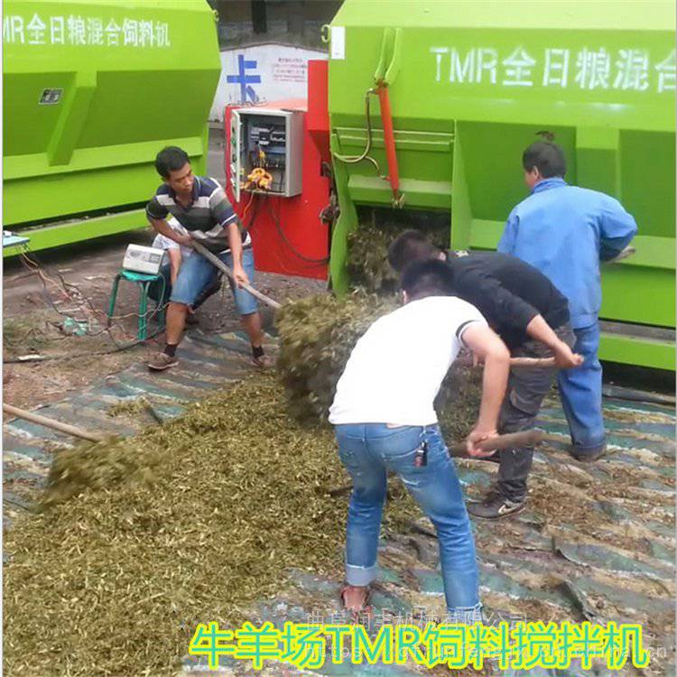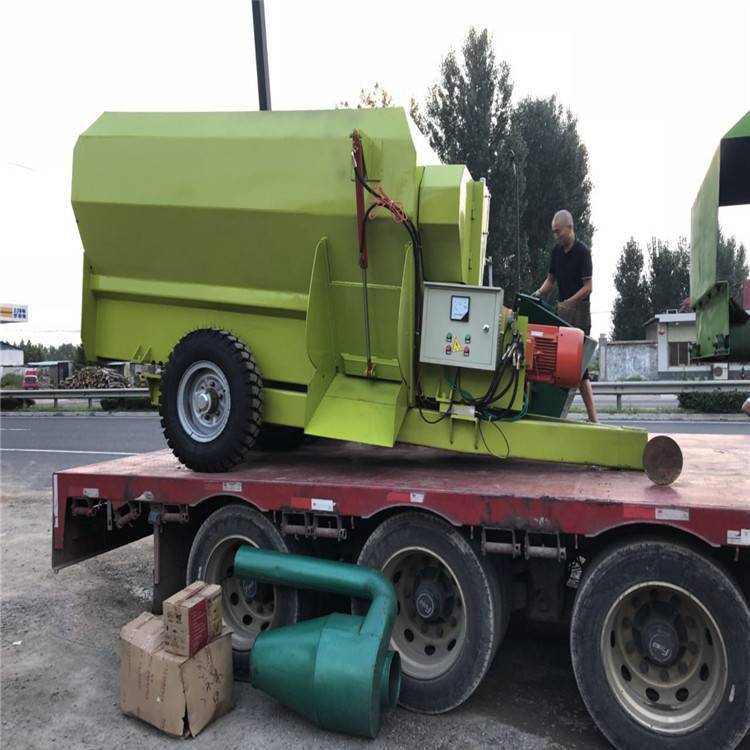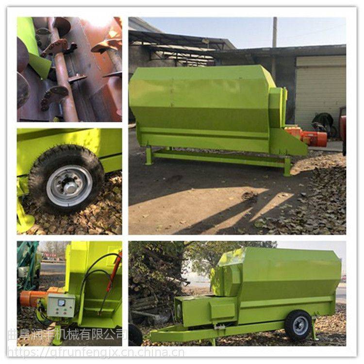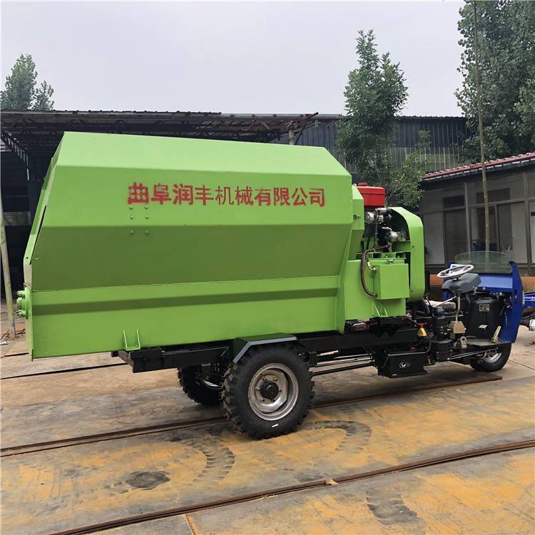 由于牛舍、羊舍及槽道限制,无法实现日粮直接投放的传统牛、羊场。牛羊养殖场双蛟龙拌草机 三轮式TMR饲料搅拌车润丰
