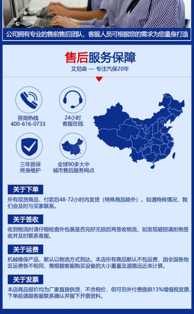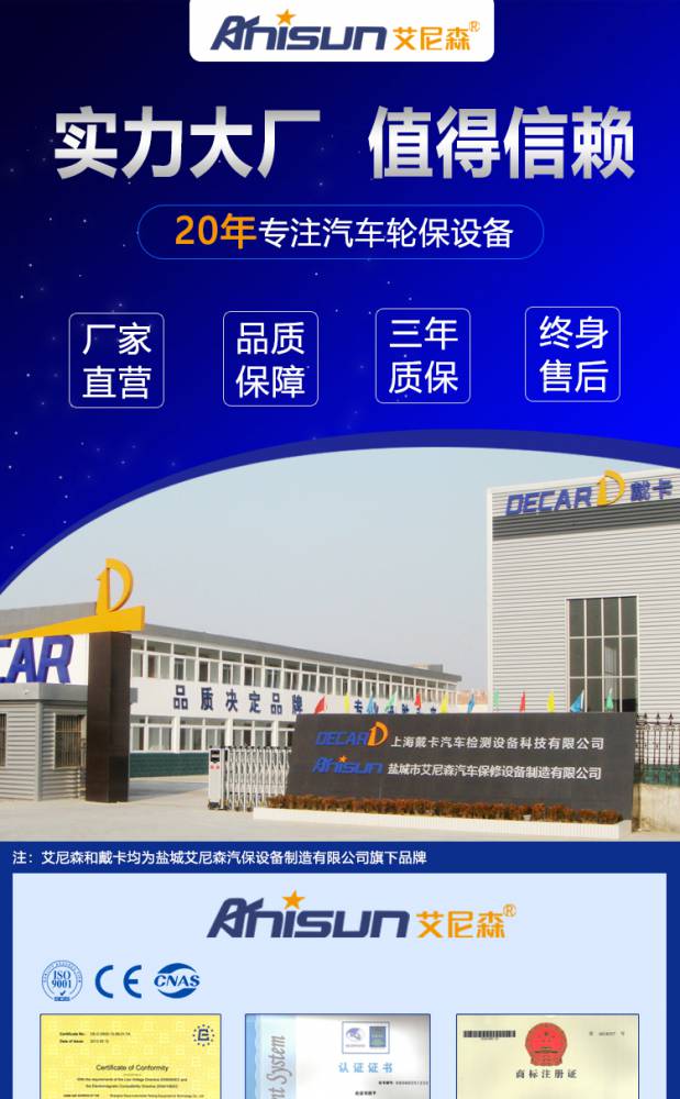 盐城市艾尼森汽车保修设备制造有限公司一家集汽车检测设备和汽车维修设备研发生产的专业公司,公司的主营产品有四轮定位仪、举升机、轮胎动平衡机、轮胎拆装机、三协绕线器等。 公司现有生产基地12000多平方米,标准产房2400平方米,办公楼600平方米,设有专业化的下料车间、精加工车间、焊接车间、前处理车间、喷涂烤漆车间、组装车间、电气电子控制车间、设备调试车间。公司拥有专门的研发机构和高素质的专业技术人才,形成强大的整体研发团队,不断跟踪国际汽车检测行业,并消化吸收开发出符合行业发展趋势的技术。 自公司2004今年投产以来,产品已经配套了数百家汽车维修厂、汽车专营店、汽车4S店,并为多家高校配备了教学专用四轮定位仪。我公司在2009年时我公司积极***市场,产品远销日本、澳大利亚、南非、俄罗斯、波兰、美国、印度、韩国等等,以过硬的产品质量、赢得了客户的一致好评。 我公司严格按照***9000标准经行产品的研发、设计、制造、销售、服务,赢得了社会各界的好评。成为“中国汽车保修协会”会员单位和“中国汽保行业协会”会员单位。汽车丰富人类的便利生活不可或缺的交通工具,本公司的四轮定位仪产品时提高汽车的安全行驶和汽车维修业的、轮胎保养业的省力化作出了贡献。 盐城市艾尼森汽车保修设备制造有限公司的诚信、实力和产品质量获得***的认可。欢迎各界朋友莅临盐城市艾尼森汽车保修设备制造有限公司参观、指导和业务洽谈。