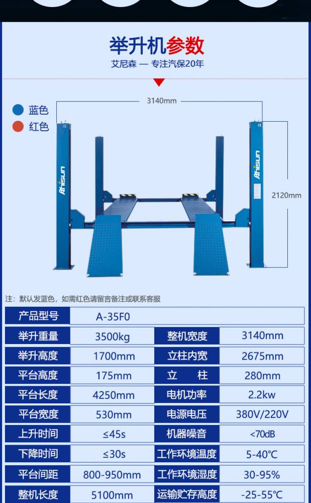 | 类型:四柱举升机 | 型号:ANS-35F0 | 举升重量:3500kg |