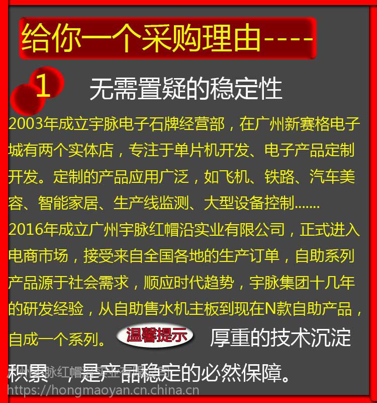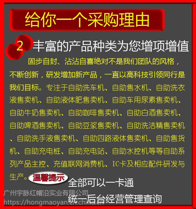 广州宇脉红帽沿实业有限公司(以下简称宇脉红帽沿实业)是一家专门致力于自助洗车机研发生产与销售的科技创新型实体企业,广东省守合同重信用单位。 公司致力于自助洗车机的研发生产与销售。以“只有客户好、公司才能发展得更好”的服务理念,凭借着“天道酬勤,商道酬信,人道酬善“的执着和诚信,获得了国内外大批行业合作伙伴的青睐,产品遍及中国大陆及港澳台、并远销至新加坡、马来西亚、印度尼西亚、俄罗斯、哈萨克斯坦、吉尔吉斯斯坦等国家,在行业及市场上都赢得了良好的***和美誉度。同样的价格比品质,同样的品质比价格,同样的价格品质再比服务,综合性价比、售后服务质量是宇脉红帽沿实业有限公司能在激烈的市场竞争环境中立于不败之地的法宝。 ***科技,是宇脉红帽沿的核心优势。公司技术团队潜心研发,打造出自己拥有核心技术的性能稳定、便于使用、便于维护及维修的***产品。凭借多项***技术及过硬的品质,公司生产的自助洗车机产品被认定为广东省高新技术产品。 广州宇脉红帽沿实业有限公司携手广州宇脉电子科技有限公司、广州居科电器有限公司,广州宇灿自助科技有限公司一道协同发展,联手打造自助行业设备产品群,构建智慧社会智能消费会员一卡通。 展望未来,公司将继续秉承“诚信、责任、进取、创新”的企业理念,致力于联网自助设备的智能化、便捷化、数据化、功能化的更加完善,一如既往地持续推进***战略,进一步强化公司的核心理念,继续***行业健康良性发展,成为自助洗车机领域的***企业。 广州宇脉红帽沿实业有限公司咨询联系人袁文兴先生,15918888315