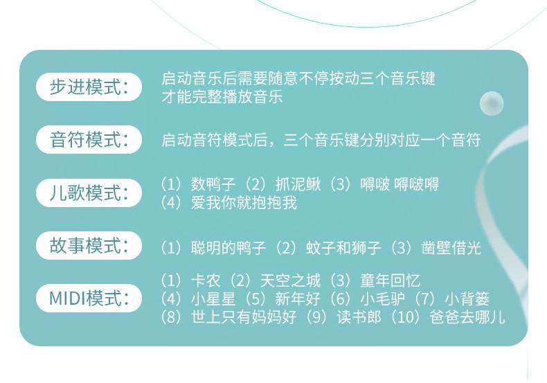 | 适用人群:不限 | 玩具材质:塑胶 | 能力培养:情感、 视觉、 智力开发、 爬行、 动手动脑、 抓握、 感官、 手眼协调、 其他能力培养、 互动玩具、 听觉、 亲子交流、 兴趣培养 |