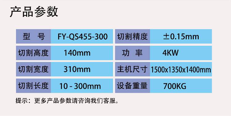 | 型号:FY-QS455-300 | 切割能力:310*140mm | 空载转速:3200rpm |