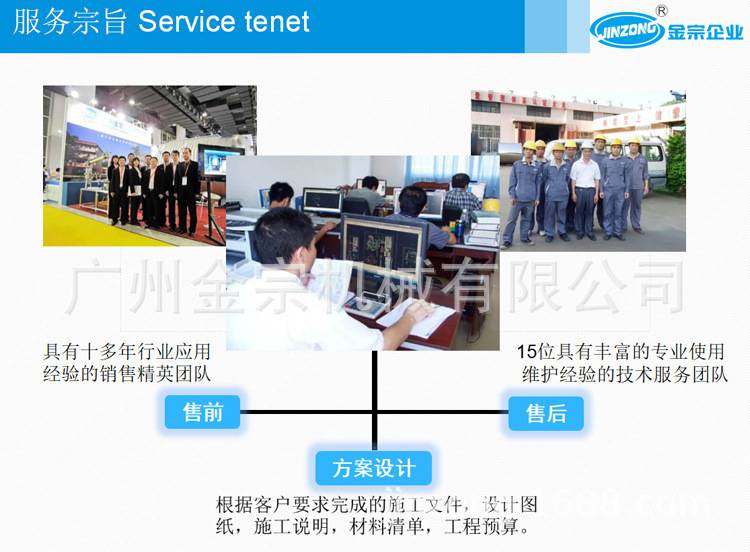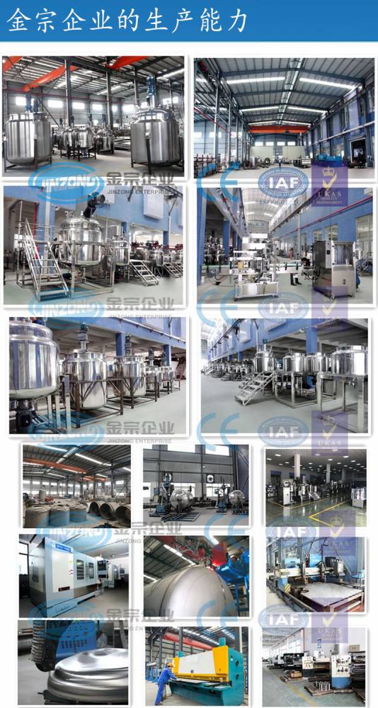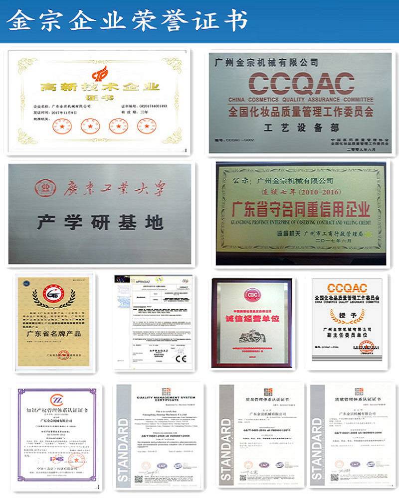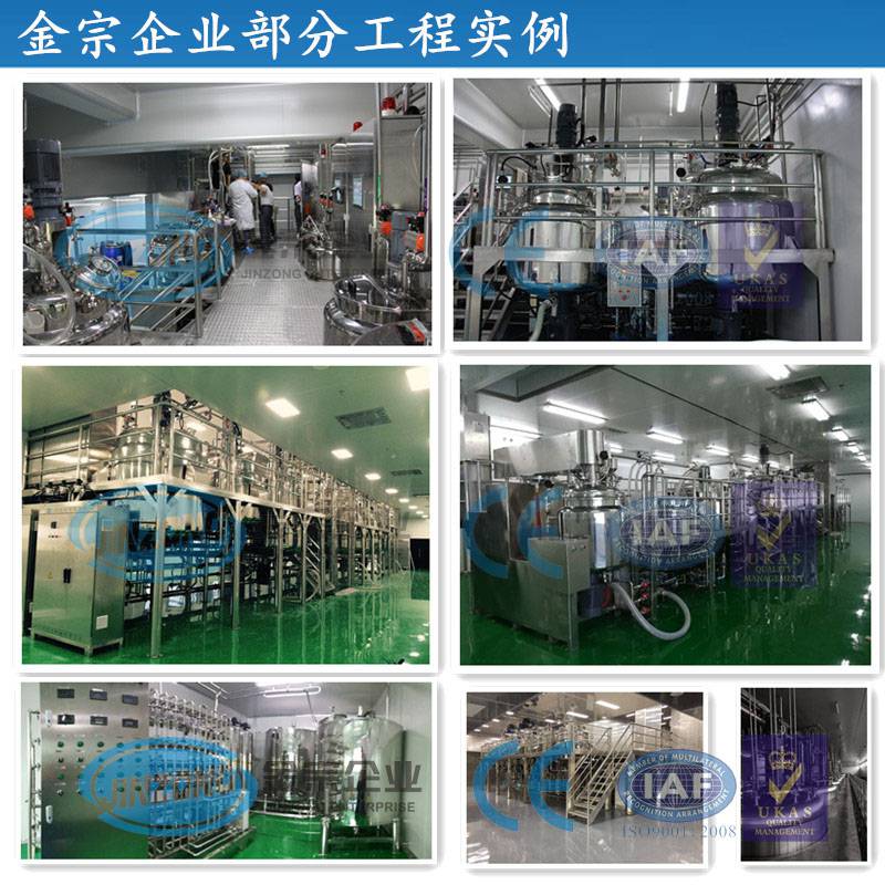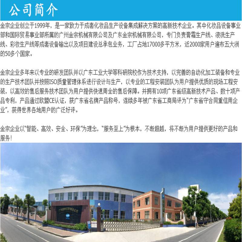 金宗企业创立于1999年,是一家致力于成套食品、药品、化妆品、涂料、化工新材料等生产设备集成解决方案的高新技术企业。其中食品设备事业部、化妆品设备事业部、制药设备事业部和国际贸易事业部所属的金宗科技(广州)股份有限公司及广东金宗机械有限公司,专业设计水果酶解提纯饮料生产线、食品添加剂生产线、调味酱料生产线、巧克力果酱生产线、甘油二脂食用油生产线、香精香料萃取生产线、消毒凝胶生产线、混悬液生产线、膏霜生产线、液洗生产线、彩妆生产线、润滑油脂生产线、农药水乳剂生产线、金属表面处理剂生产线、树脂产品生产线、高分子材料生产线、颜料油墨生产线、电池浆料生产线、有机硅胶生产线、RO反渗透纯水系统等智能化、无菌化的成套设备输出以及项目建设总承包业务,两个工厂占地70多亩,近2000家用户遍布五大洲的50多个国家。 金宗企业多年来以专业的研发团队并以广东工业大学等科研院校作为技术支持,以完善的自动化加工装备和专业的生产技术团队并按照***质量管理体系进行设计与生产,以专业的工程安装团队为用户提供优质的现场工程安装,以高效的售后服务技术团队为用户提供快速周全的售后保障。并拥有10项广东省级高新技术产品、数十项产品***,产品通过欧盟CE认证,获广东省***称号,连续多年被广东省工商局评为“广东省守合同重信用企业”,获得世界各地用户的广泛好评。 金宗企业以“智能、高效、安全、环保”为理念,“服务至上”为根本,不断超越,将不断为用户提供更好的产品和服务!