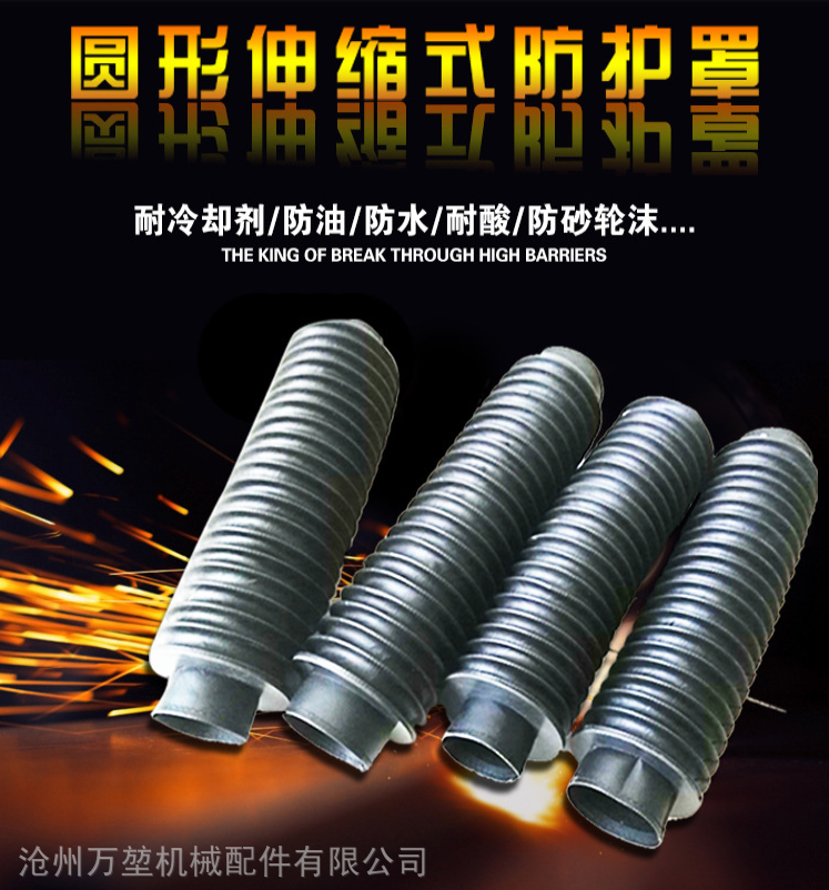 伸缩式圆形防尘罩可以用来对丝杠、光杠、立柱、心轴及其它的圆形旋转柱体进行防护。