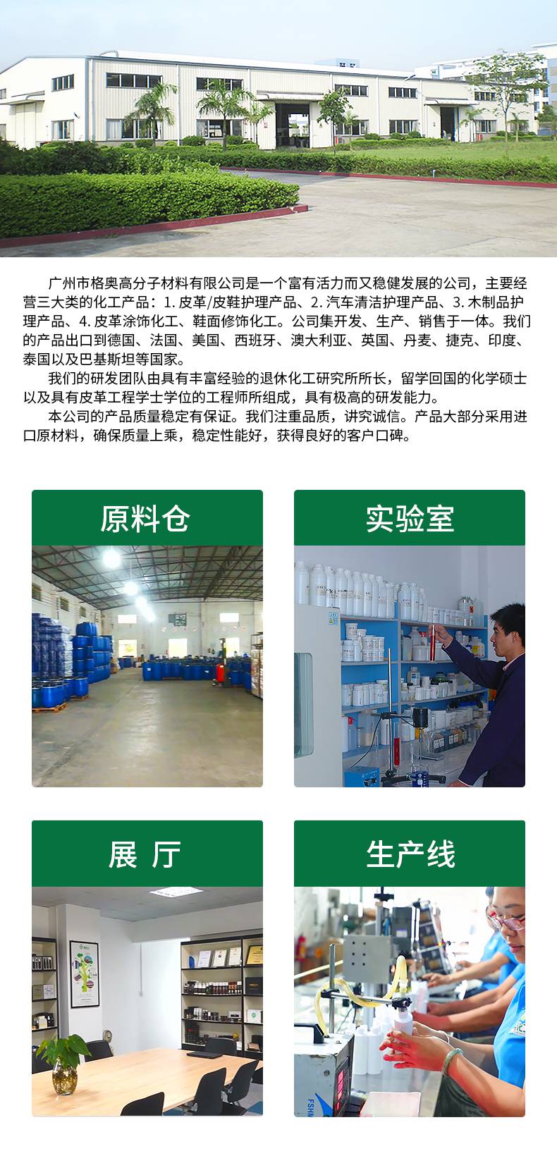 广州市格奥高分子材料有限公司是一个富有活力而又稳健发展的公司,主要经营三大类的化工产品:1. 皮革涂饰化工(含皮革手感剂)。2. 鞋面修饰化工。3. 皮革/皮鞋护理产品。公司集开发、生产、销售于一体,主要服务于皮革、皮鞋化工市场的中间贸易商。我们的产品特别是皮革/皮鞋护理保养产品出口到澳大利亚、德国、英国、丹麦、捷克、印度、泰国以及巴基斯坦等国家。 本公司的产品既专业又全面。我们的开发团队由具有丰富经验的退休化工研究所所长,留学回国的化学硕士以及具有皮革工程学士学位的工程师所组成,具有极高的研发能力。 本公司的产品质量稳定有***。我们注重品质,讲究诚信。产品大部分采用进口原材料,确保质量***,稳定性能好。 本公司的服务富有个性化。因为有开发团队专业而强有力的支持,所以我们还可以根据客户的不同需要,研发生产新的产品。只要您有需要,我们就会努力做到。 我们的愿景 以人为本,重视环保,成为皮革及鞋材化工市场***赖的***。 我们的使命 持续改善品质,利用新型进口原材料和技术,为皮革及鞋材化工市场提供超价值、高品质的产品。 我们的经营理念 品质***,诚信服务,利润共享。 我们的口号 格奥,让皮革更有味道!