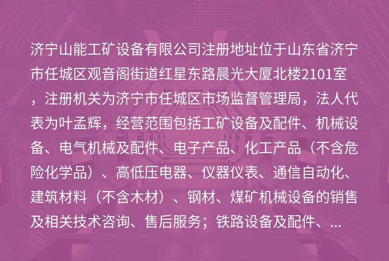 | 经营范围 | 工矿设备及配件、机械设备、电气机械及配件、电子产品、化工产品(不含危险化学品)、高低压电器、仪器仪表、通信自动化、建筑材料(不含木材)、钢材、煤矿机械设备的销售及相关技术咨询、售后服务;铁路设备及配件、救护器材、消防器材、五金工具、劳保用品、食品、液体消毒剂、第一类医疗器械的销售;货物与技术的进出口业务(国家限定或禁止经营的除外)。(依法须经批准的项目,经相关部门批准后方可开展经营活动) | ||