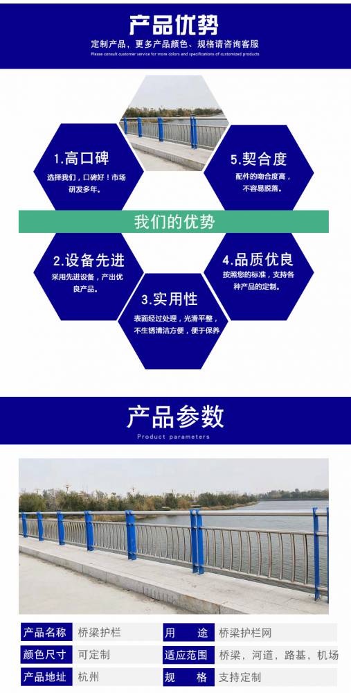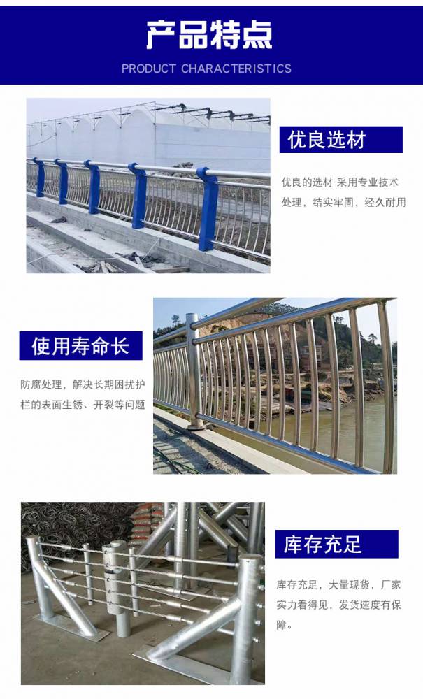 6、产品优点不锈钢桥梁景观河道护栏,它不仅具有不锈钢管的豪华美观和现代气息,又具有普通碳钢管的坚韧性。它与钢板立柱配合,做成城市、道桥等的安全栏杆。不仅牢固、大方,且可造型各异,给都市别一种亮丽风景线。