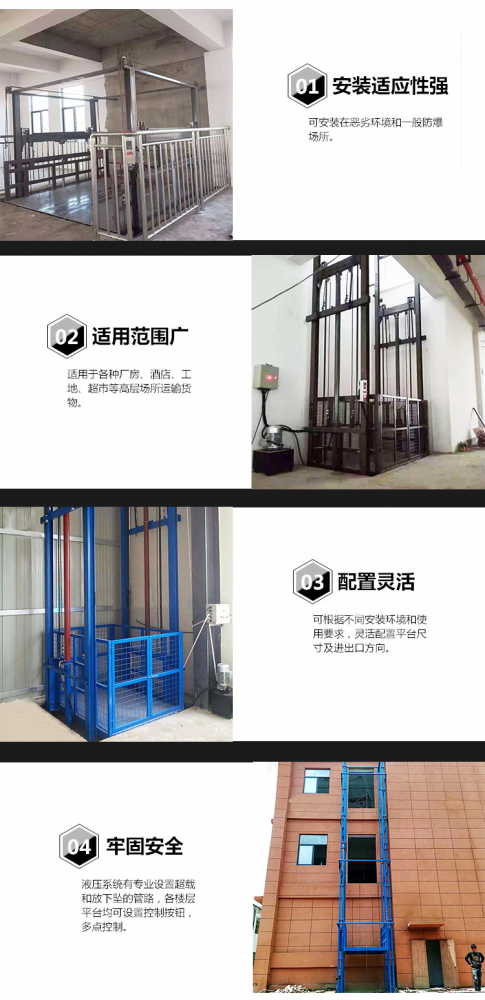 导轨式升降货梯是用于货物升降的液压升降机械设备,采用液压油缸作为主要动力,通过重型链条和钢丝绳传动,***机器运行的安全。无需地坑和机房,适合于有地下室、仓库改造、新建货架等,具有安装维修方便、美观、安全、操作方便。