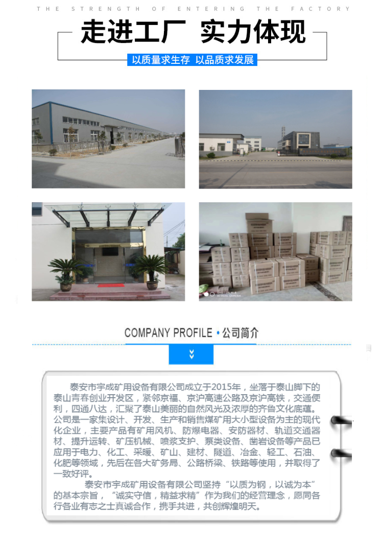 泰安市宇成矿用设备有限公司成立于2015年,坐落于***泰山脚下的泰山青春创业开发区,紧邻京福、京沪高速公路及京沪高铁,交通便利,四通八达,汇聚了泰山美丽的自然风光及浓厚的齐鲁文化底蕴。公司是一家集设计、开发、生产和销售煤矿用大小型设备为主的民营企业,产品已广泛应用于:神华集团、兖州煤业、大同矿业、枣矿集团、新汶矿业集团、永煤集团、焦煤集团、平顶山煤业矿业集团、靖远煤业等***矿区百余座煤矿,并取得了重要成果。 泰安市宇成矿用设备有限公司秉承“规范、科学、创新”的企业特色,以“宇量胸怀、成就未来”为座右铭,以始终***“一切以用户为中心,了解用户、满足用户、顾客驱动,合作共赢”以及“同等质量比价格,同等价格比服务”的***管理理念,为客户提供完善的售前、售中、售后一体化服务,我们相信诚实正直、***进取地为公司发展做正确的事情,将为公司和个人带来共同的利益和进步,经过不断的努力和超越已经成为一家在***具有相当规模、较大影响力、发展迅速的企业之一。 公司坚持“以质为钢,以诚为本”的基本宗旨,“诚实守信,精益求精”作为我们的经营理念,愿同各行各业有志之士真诚合作,携手共进,共创辉煌明天。