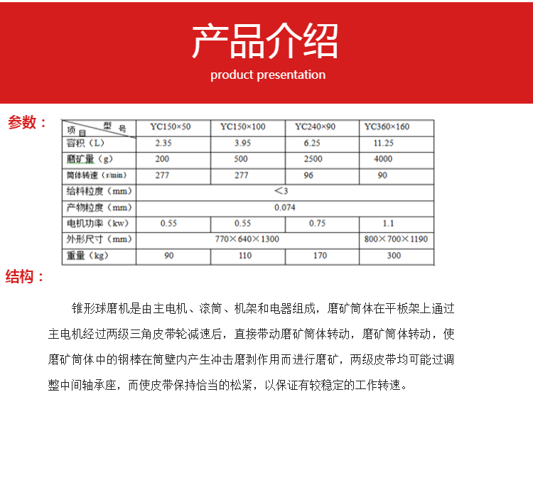 | 最大进料粒度:3mm | 出料粒度:0.074mm | 给料口尺寸:1*1*1 |