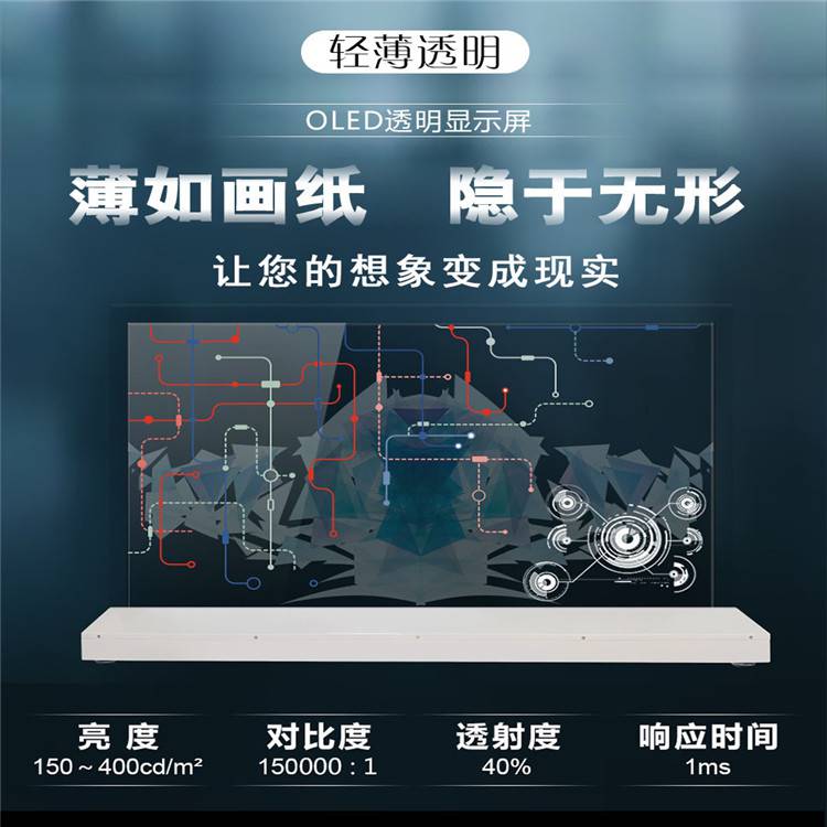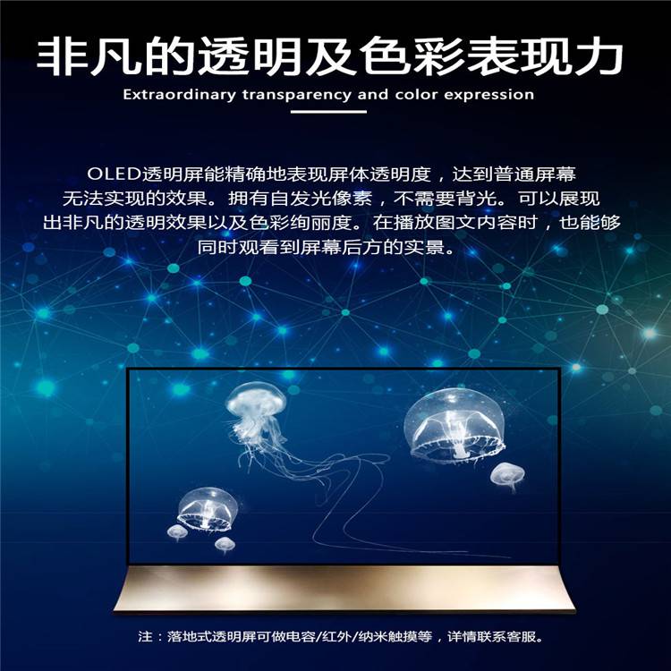 OLED透明屏能***地表现屏体透明度,达到普通屏幕无法实现的效果。拥有自发光像素,不需背光。可以展现出***的透明效果和及色彩绚丽度。在播放图文内容时,也能够同时观看到屏幕后方的实景。