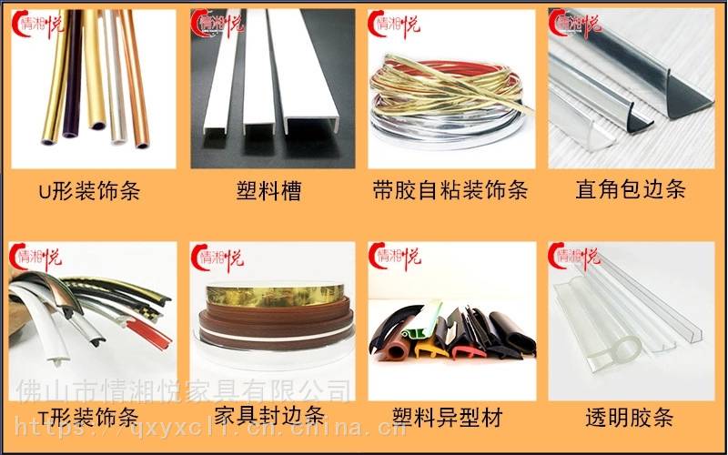 情湘悦新材料是专业生产各种塑胶型材、装饰条、包边条、封边条等各种塑料制品的企业。是行内拥有规格齐全、款型别致,颜色丰富的专业厂家。各种款型达数百款之多。颜色、规格、硬度均可按客户要求生产加工。产品销售业务由邓经理负责。